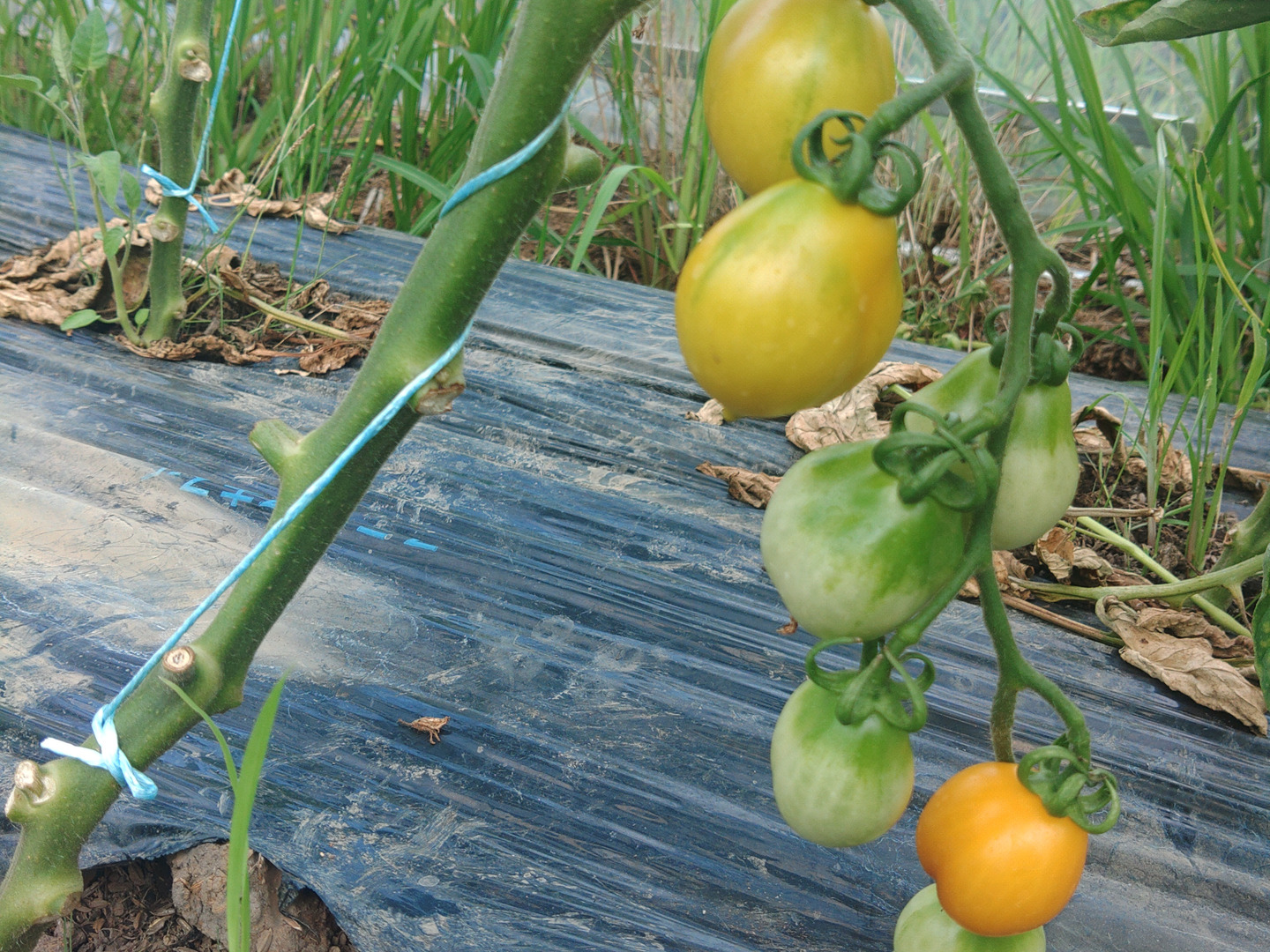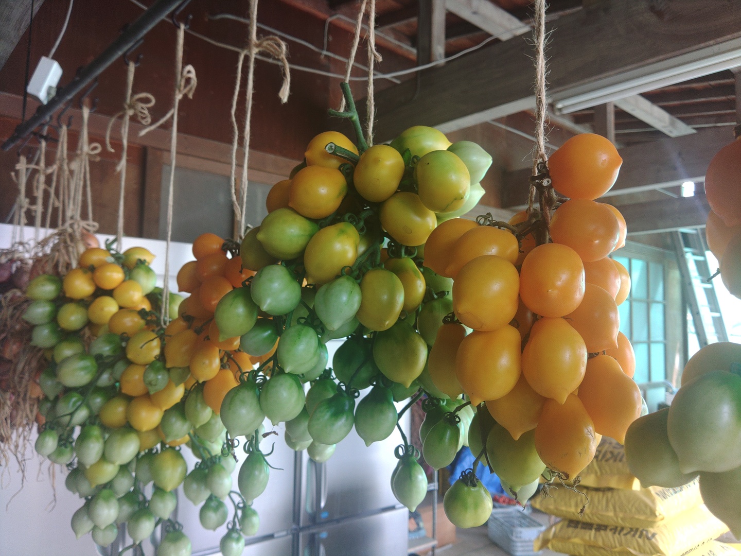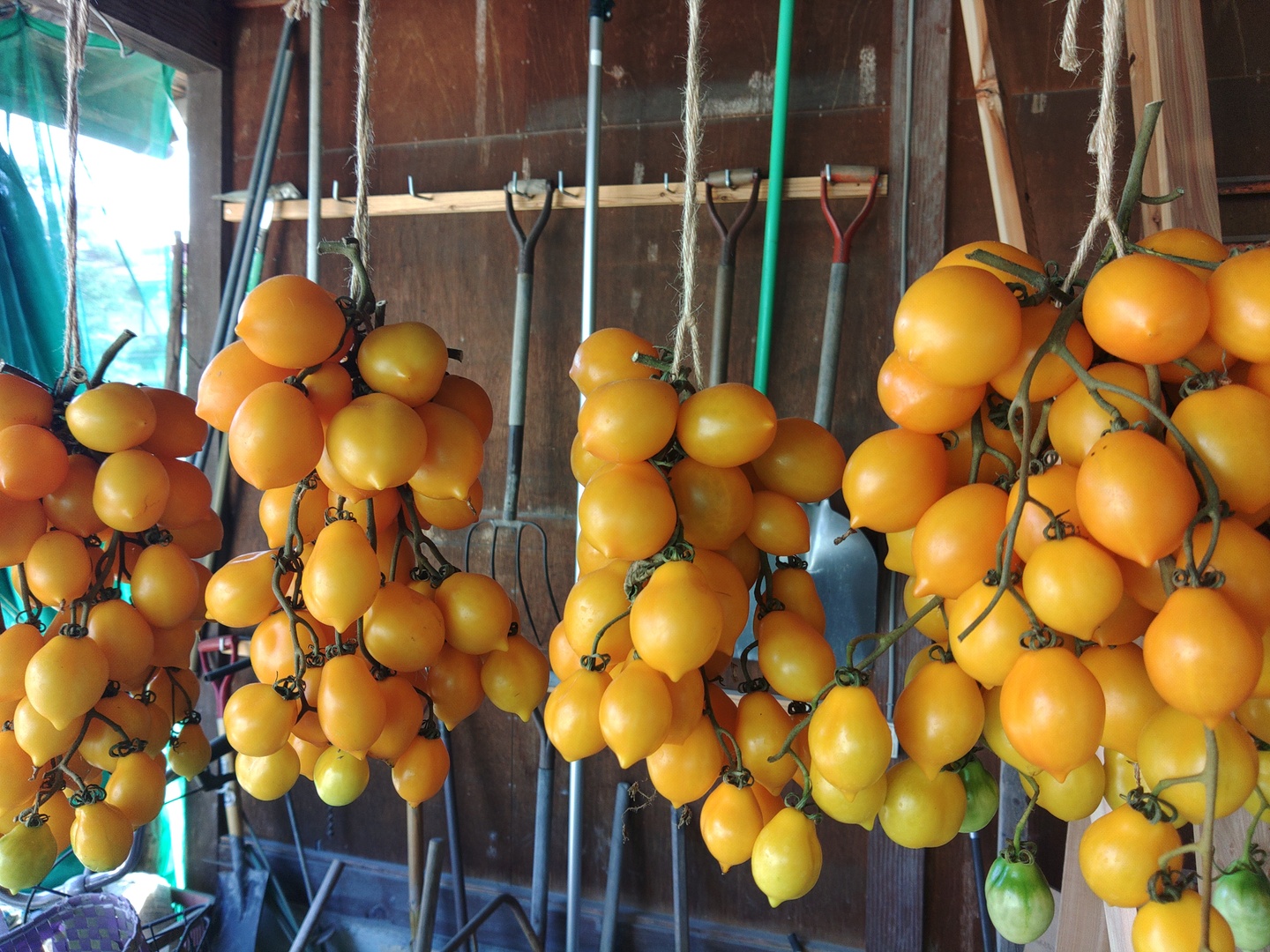 トマトの房ができ、一番上のトマトが色づいたら収穫して吊るして黄色くします。