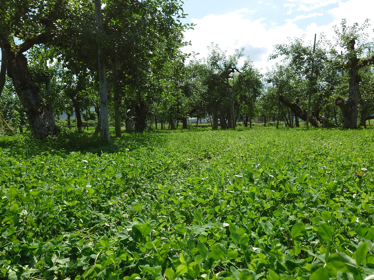当果樹園では赤く色づいたりんごを収穫するために、手間暇を惜しまず樹上のりんごを栽培管理しています。