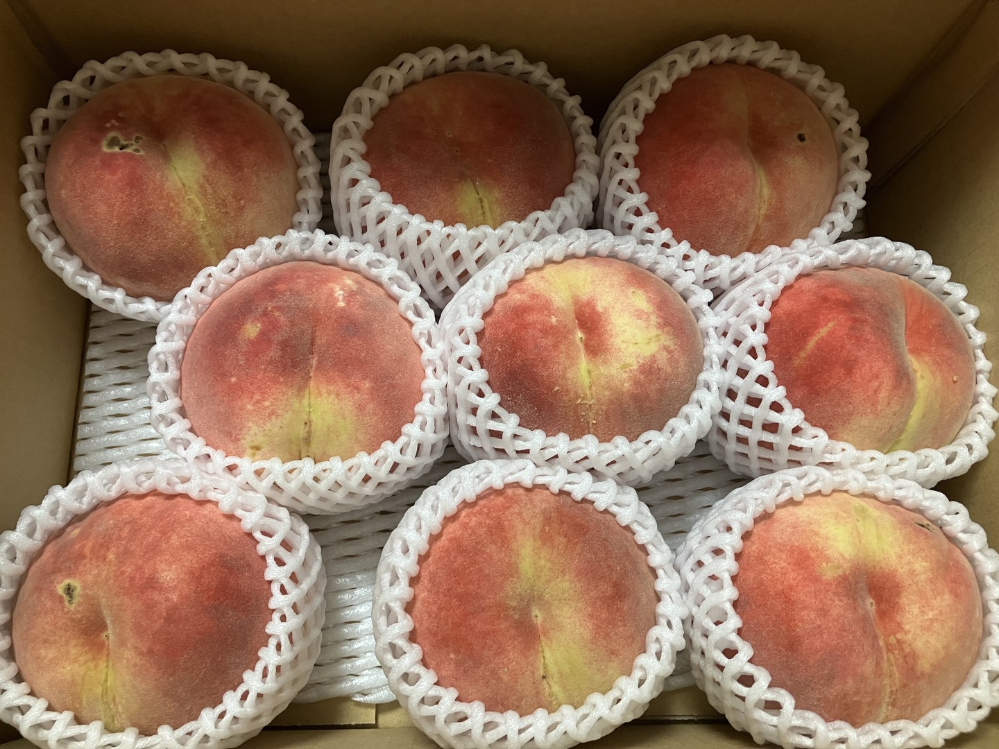 桃はお届け時に箱の下になっている方から柔らかくなって来ます。緩衝材を外してお確かめ下さい。