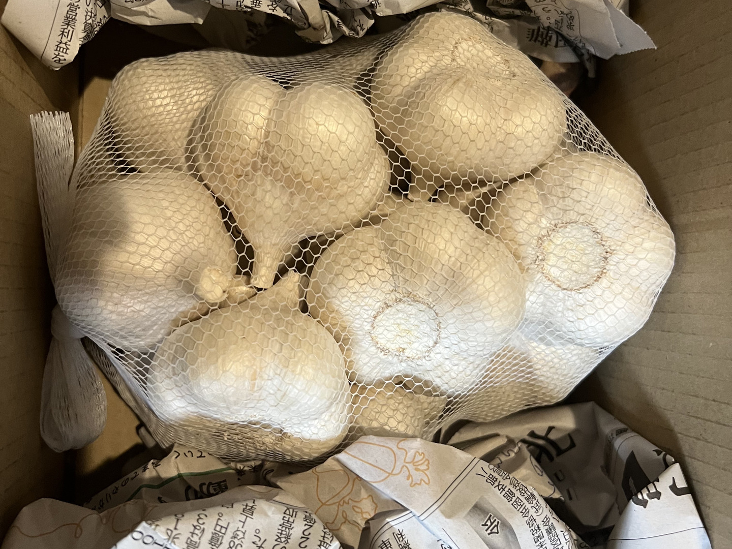 常温で保存する場合は、ネットににんにくを詰めて、直射日光の当たらない涼しい場所で保存してください。適切に乾燥させると数か月は日持ちしますが、温度や湿度条件によっては発芽したりカビが発生する場合もございますので、自己責任でお願いいたします。
