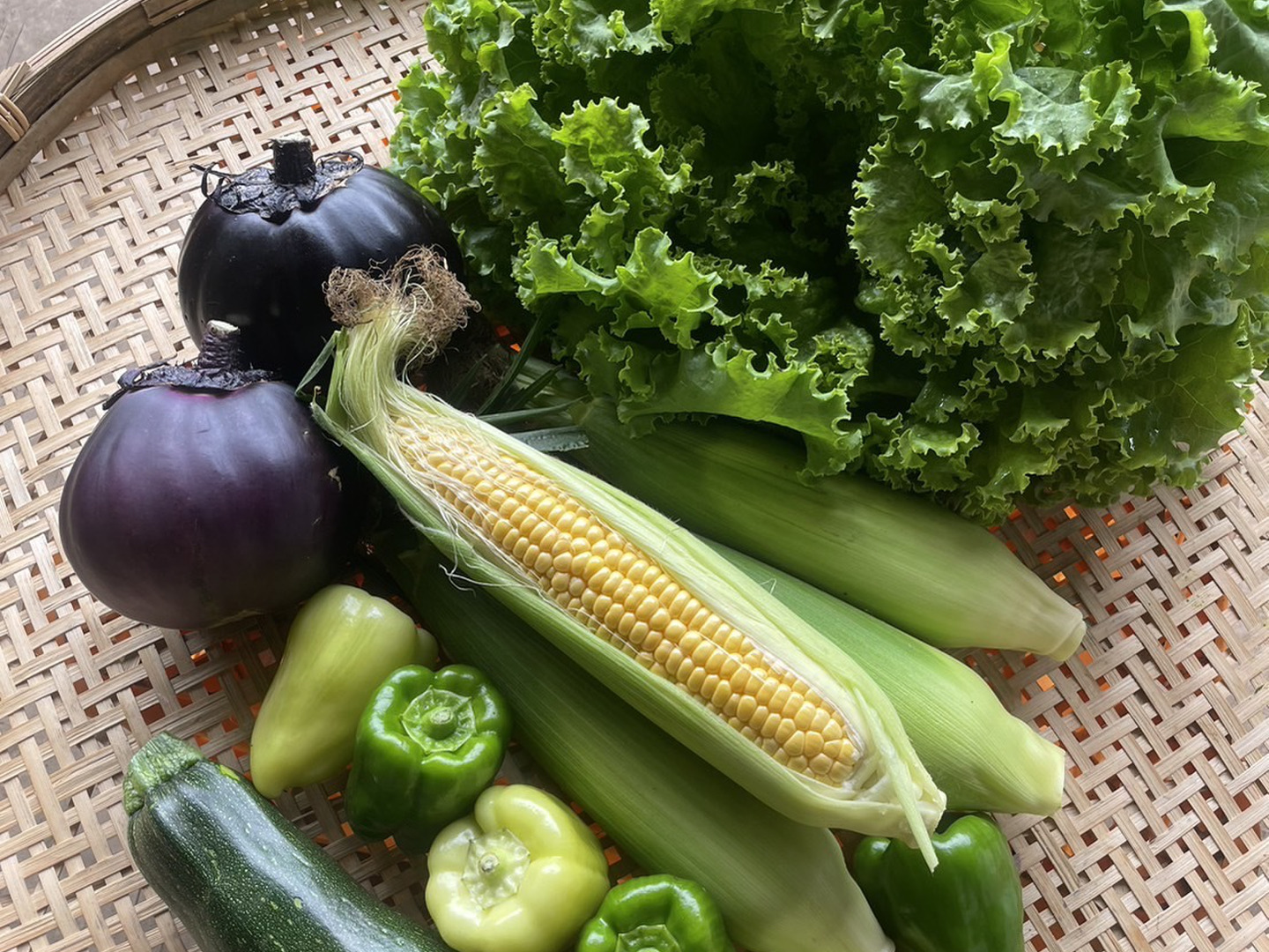 80サイズの箱に、とうもろこし5本と、おまかせ野菜3~4種類を入れてお届け致します。