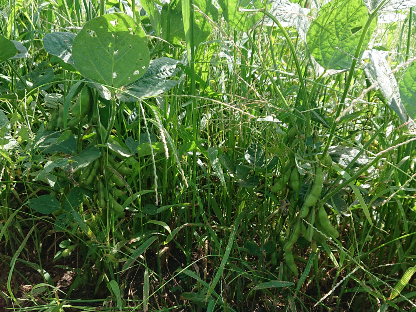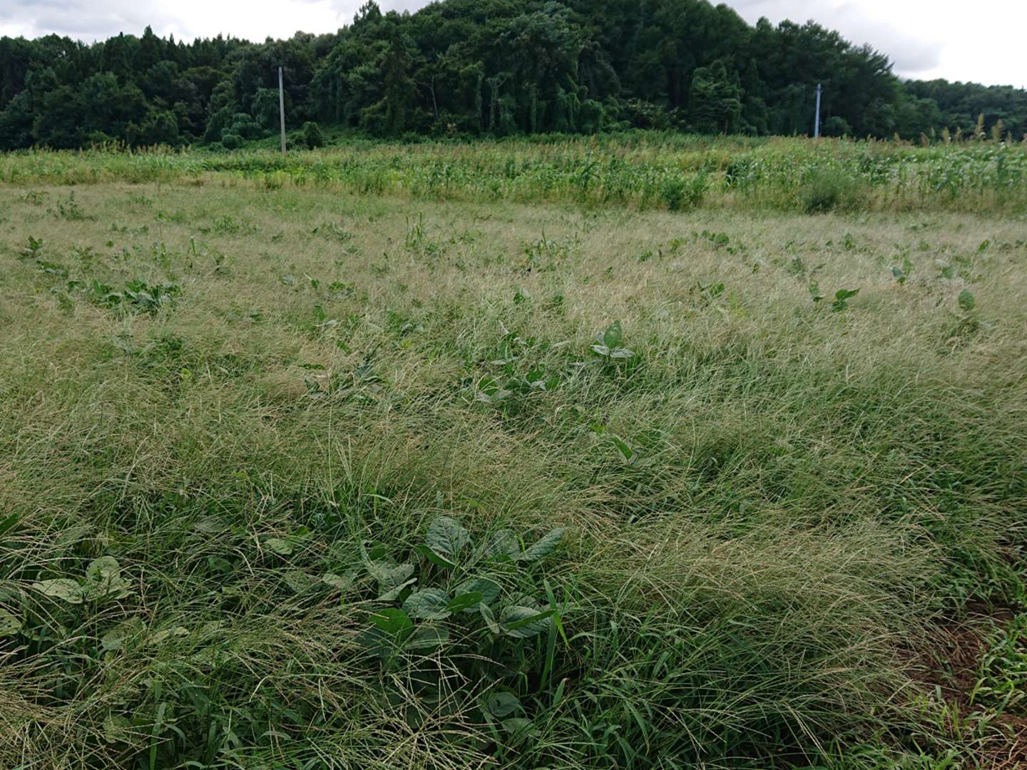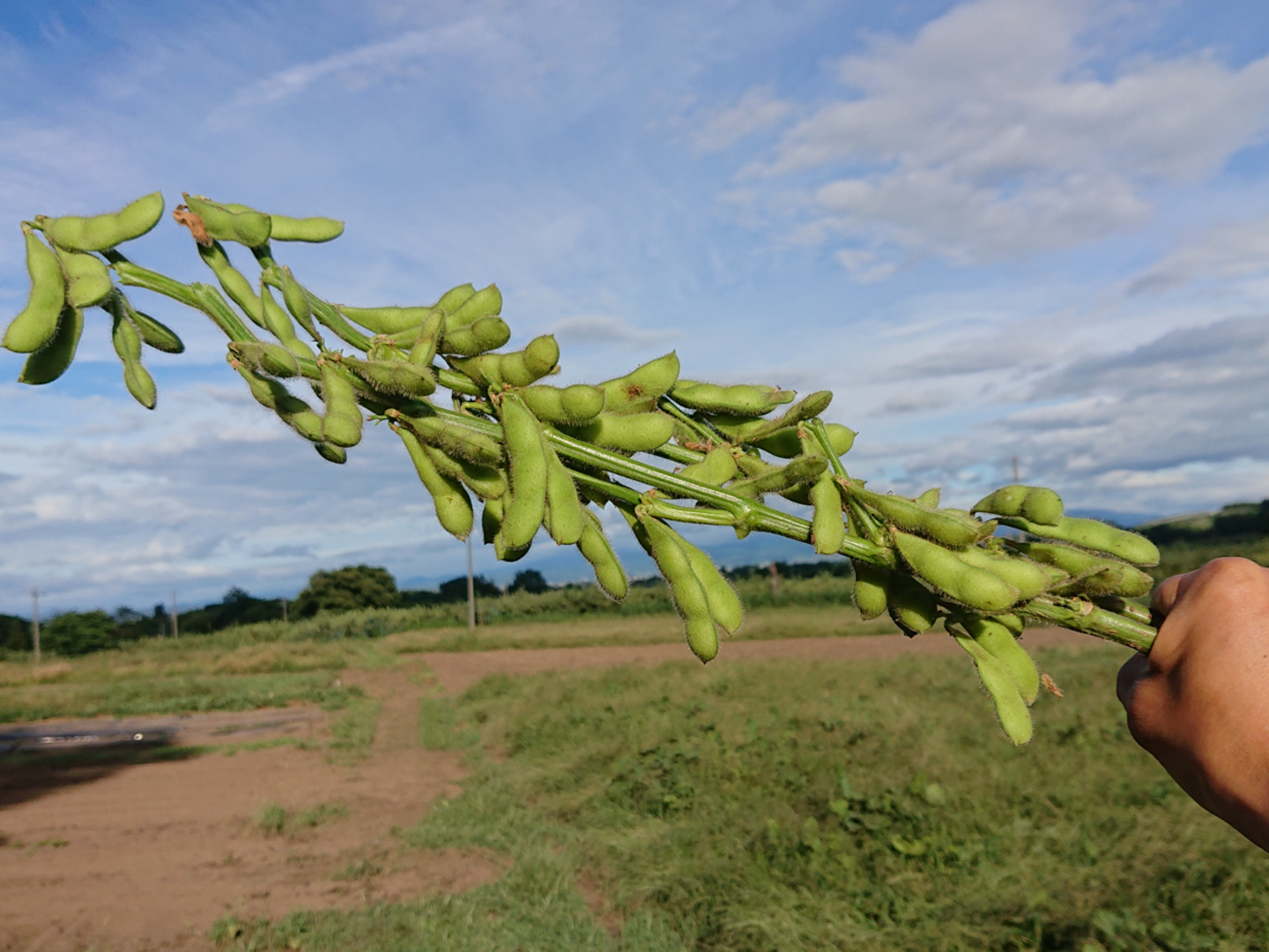 枝豆は、土地のなかで少し谷になる、水持ちの良い場所を選んで栽培しています。収量を増やすため、幼苗の段階で摘芯しています。また、思っていた以上に夏の気温が高かったので、日陰を作るために、着花後は除草せず、草に埋もれて育てるようにしていました。