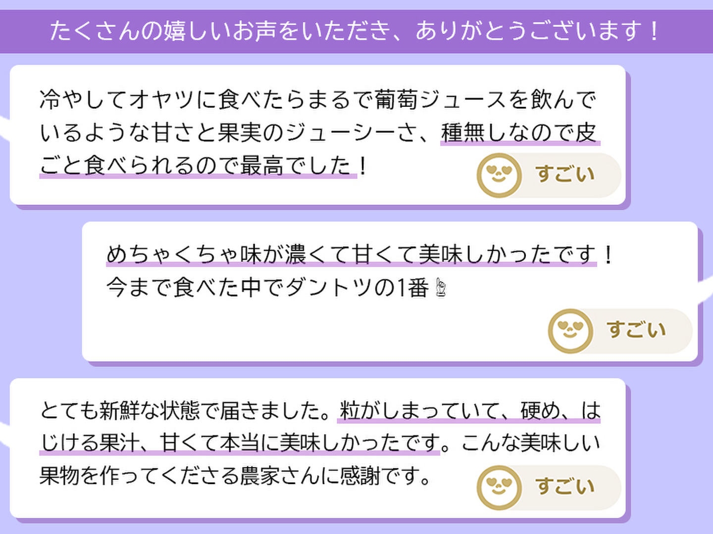 ・房の形がよくないものや紫色の浅いもの、粒落ちしたもの、房が小さいものなどをお入れします。重量確保のため、粒売り用の粒も入れる場合がありますので、ご了承ください。