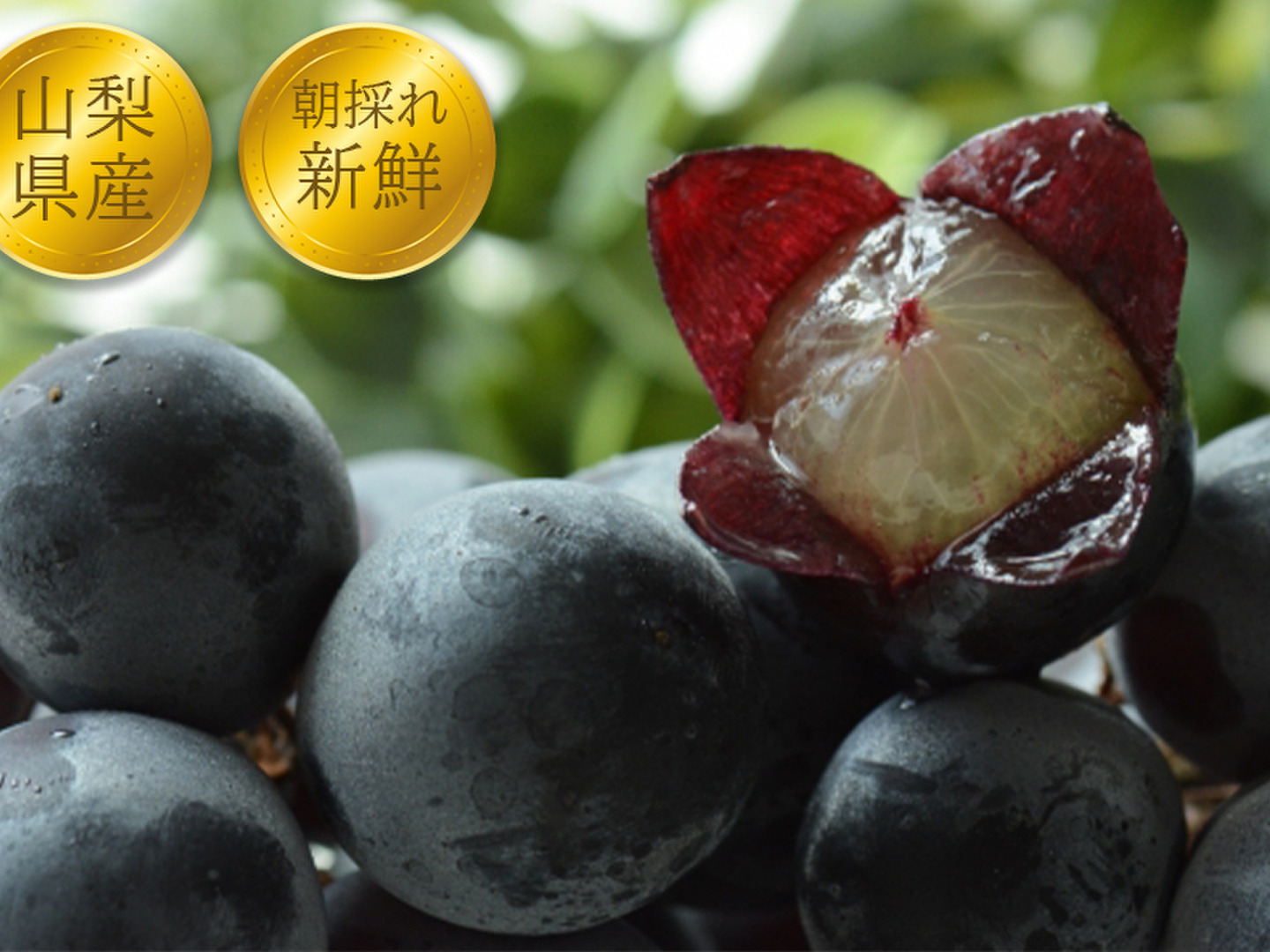 山梨県産の巨峰は、皮の色づきが濃い紫黒色で、粒がふっくらしているのが特徴です。ぶどうは次々と新品種が登場していますが、巨峰は長年にわたって根強い人気を維持しており、年配者にも高い知名度で贈答品にもおすすめです。