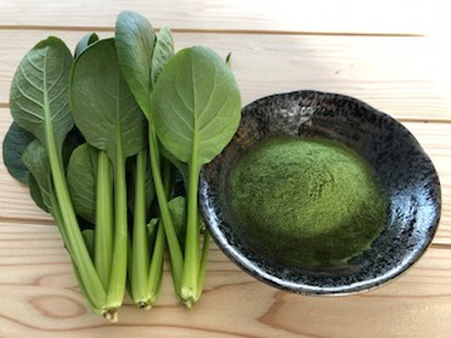 100%有機小松菜を使用したパウダーで、ゆっくり低温で乾燥させることによって有機小松菜の栄養素を損なう事無く、そのまま濃縮されたパウダーになっています。内容量40gに対して、その約15倍の量の有機小松菜を使用しています。食品添加物や合成着色料は一切使用していません。なので、収穫時期によって風味や色合いに誤差が生じる事がありますが、そそいだ愛情に誤差はありません。