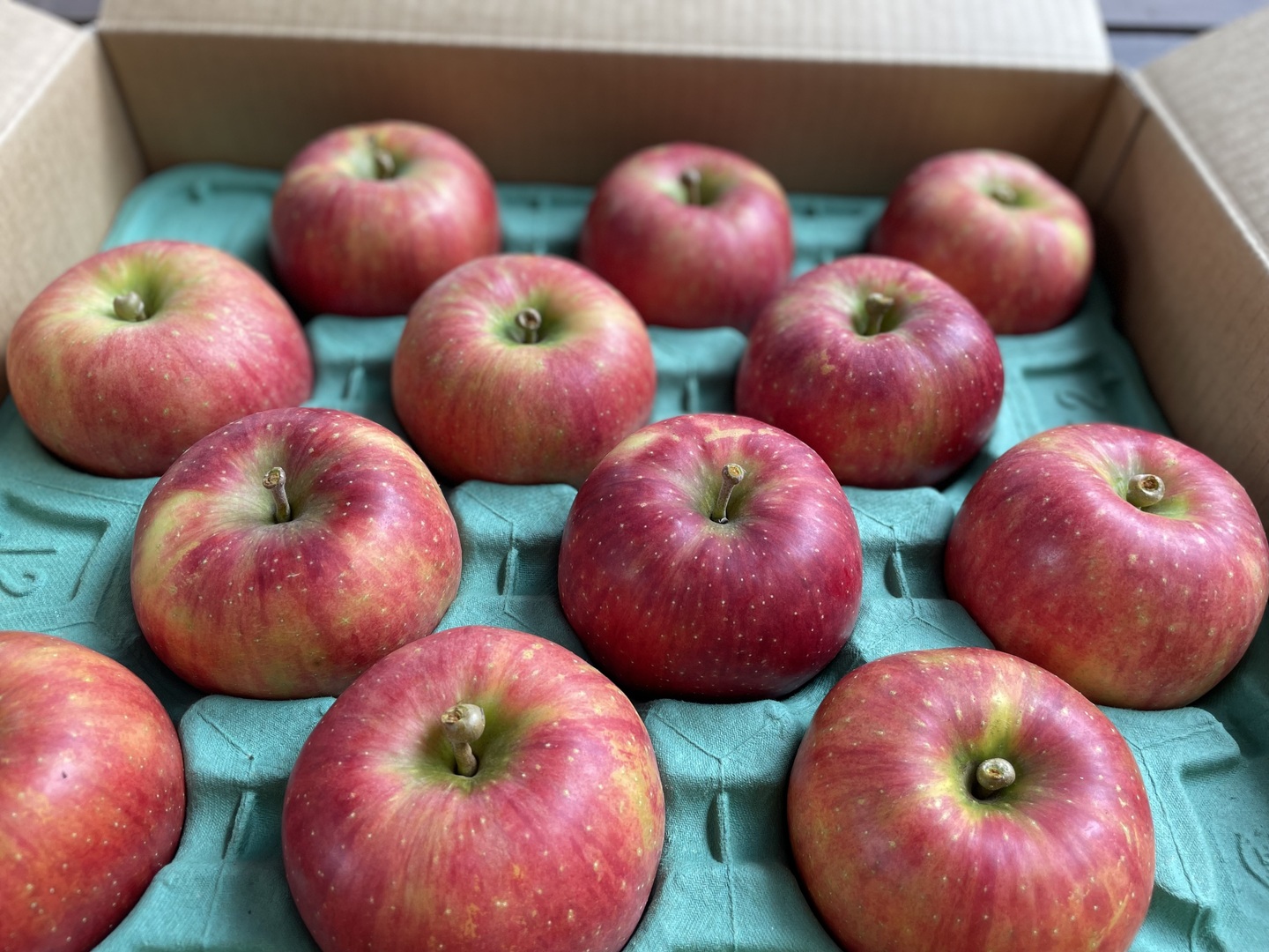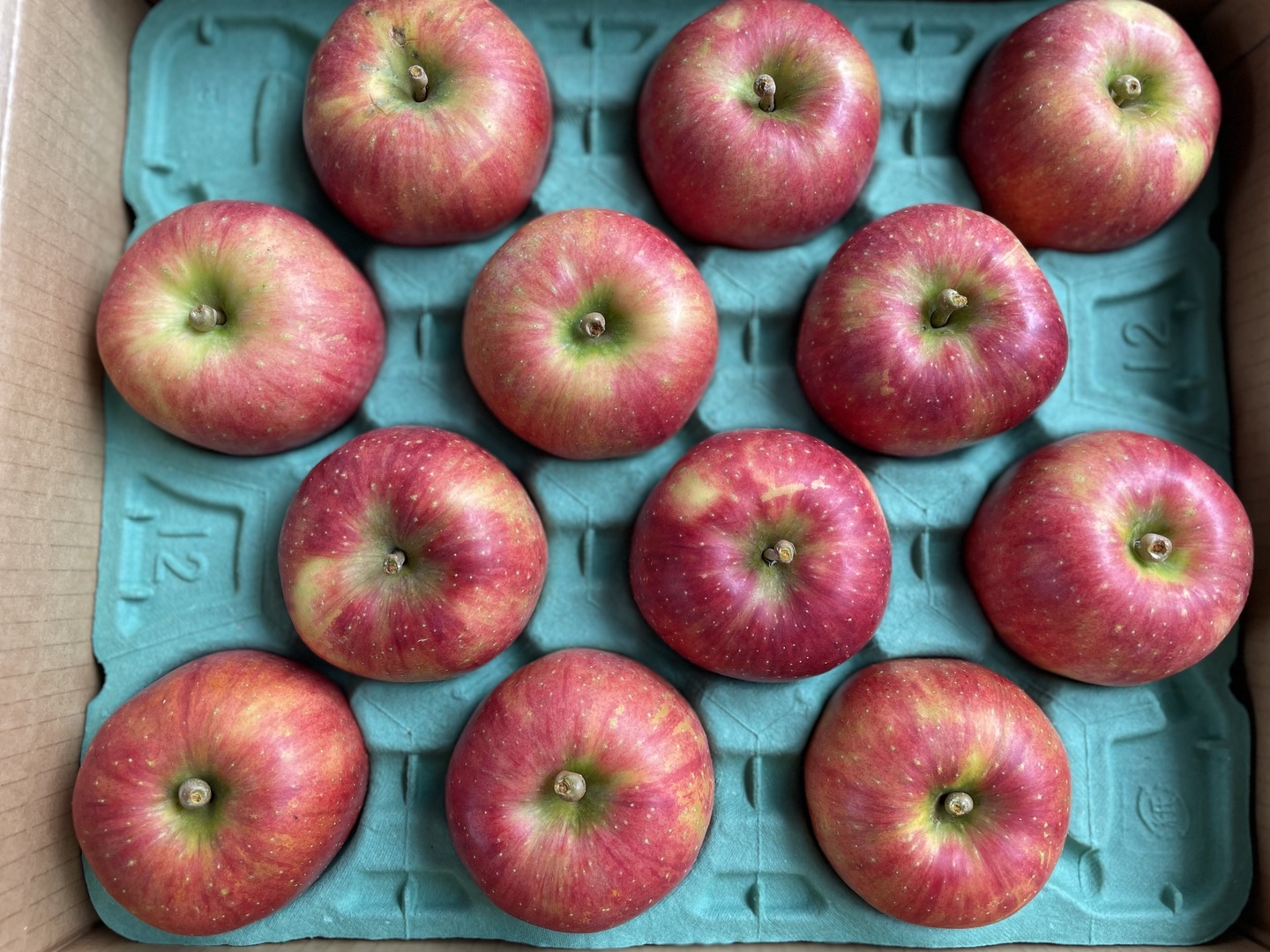 葉とらず栽培のため全面が綺麗な赤色のりんごではありませんが、すべてしっかりと完熟させてから収穫したものです。葉とらずりんごの味の濃さを実感していただければと思います。
