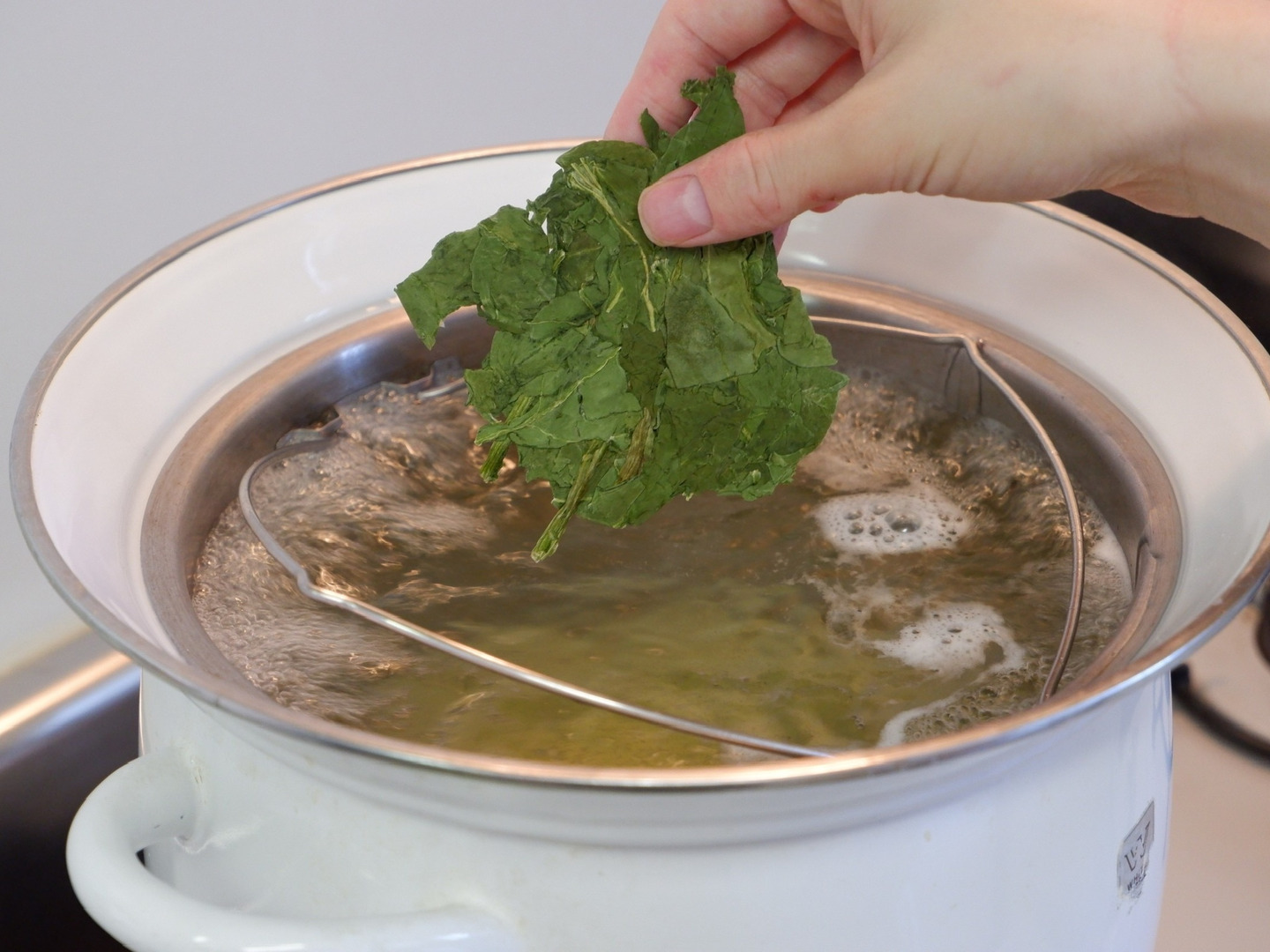 ②パスタがゆであがる1分前に乾燥ほうれん草も一緒にゆでる