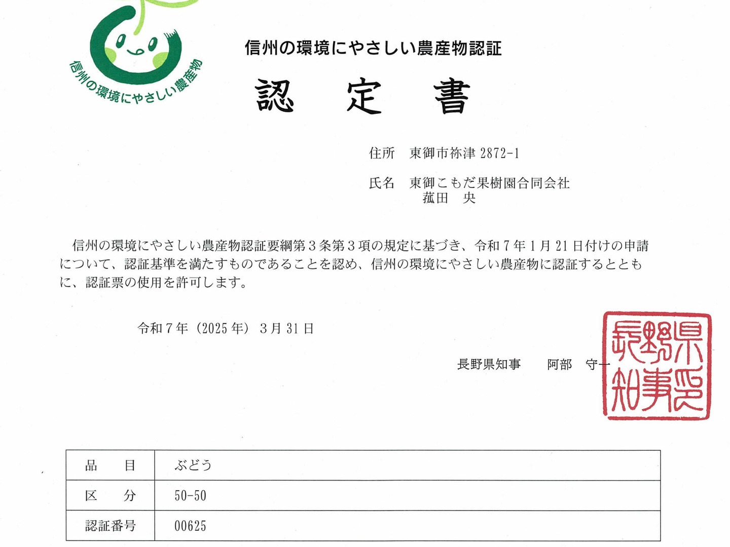 - 農薬節減栽培(信州の環境にやさしい農産物認:長野県証)