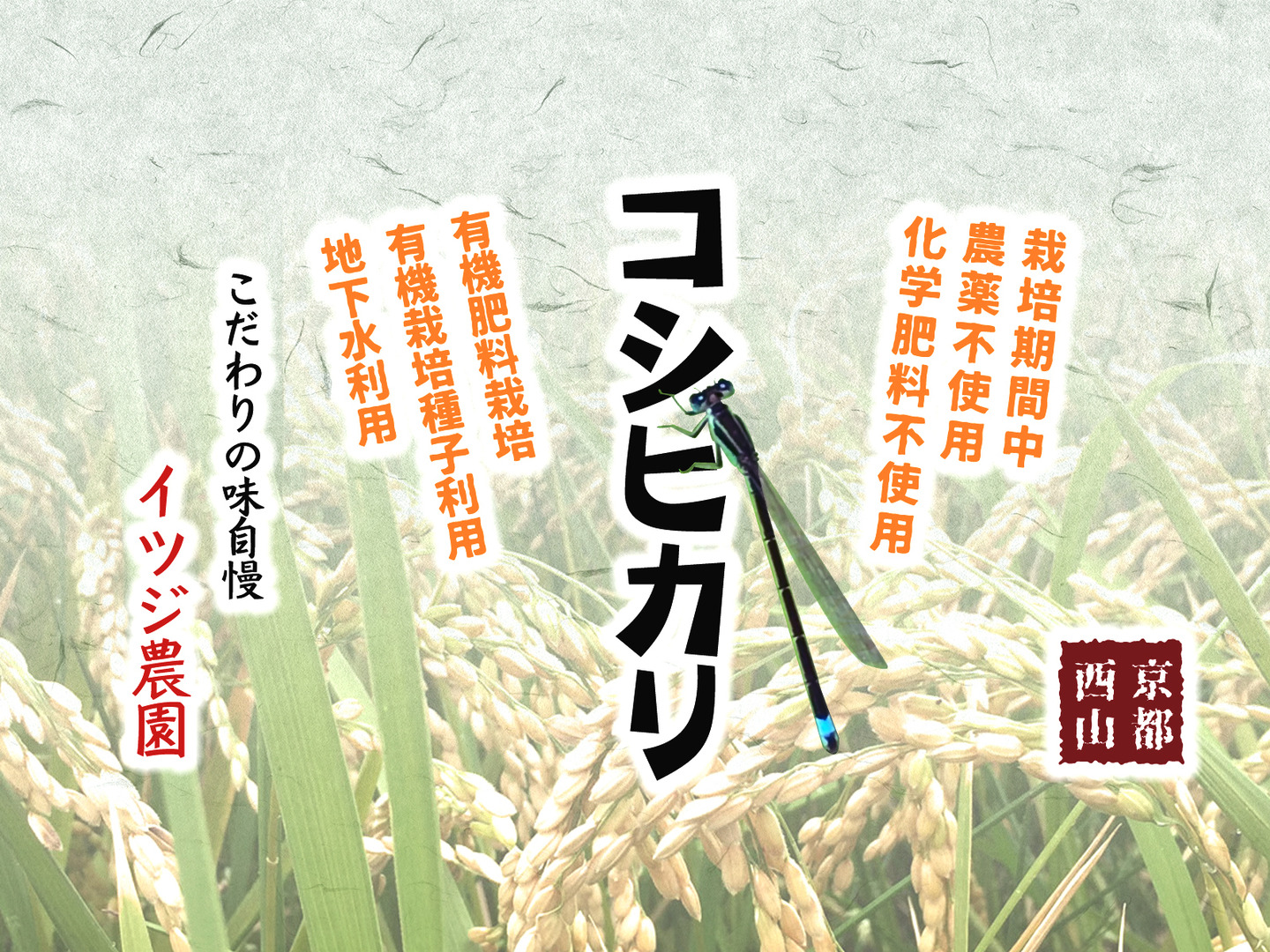 京都の地下水はカルシウム、マグネシウムが多く美味しい水として知られています。 さらに西山の水は、ナトリウムも多くミネラル分に富んでいます。 イツジ農園の水田では、京都西山の地下水を組み上げ水にこだわったお米作りをしています。
