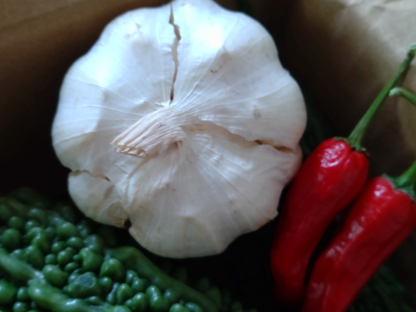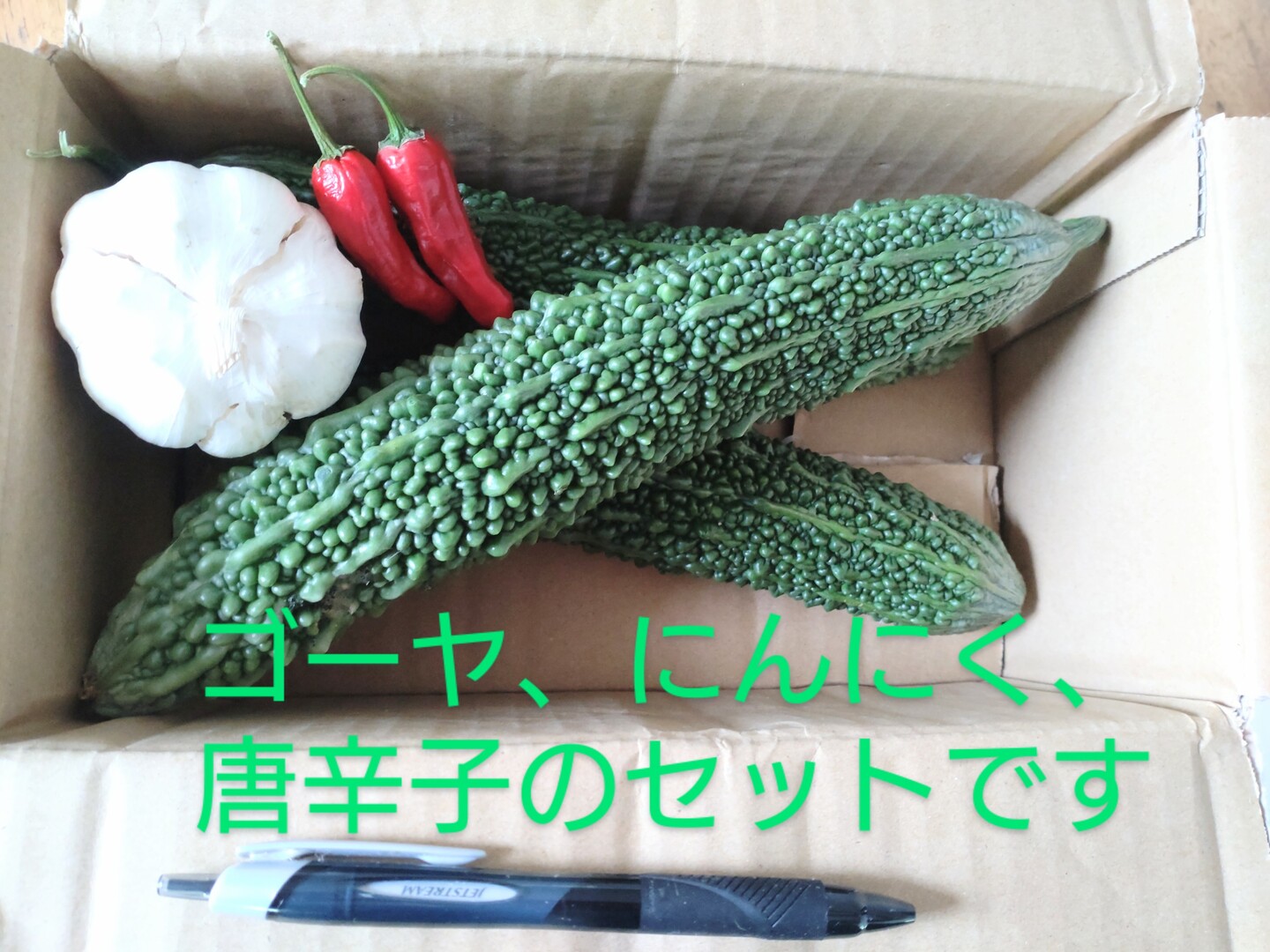 【ゴーヤのミニ野菜セット】ゴーヤ3本 にんにく一玉 唐辛子3個 採れたて♪【農薬、除草剤、化学肥料等はすべて不使用】【当農園の他の品との、まとめ買い対応(一個口の送料でお送り)の商品です】