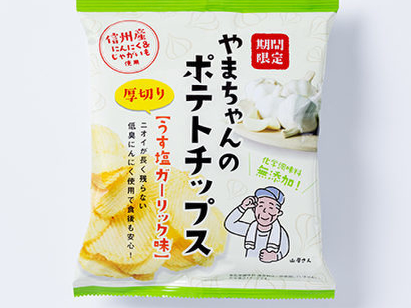 じゃがいも(遺伝子組換えでない)、植物油、釜炊き塩、ガーリックパウダー