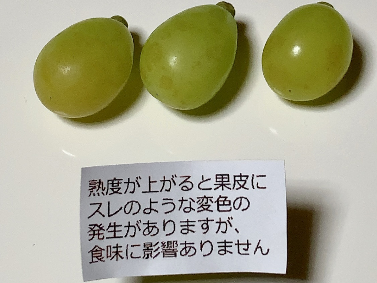 ぶどうの粒同士のきずや、かすり傷、熟度が上がった粒は黄色から茶色にシミのようになものも含まれます。(シュガースポット)食味には影響ございません。