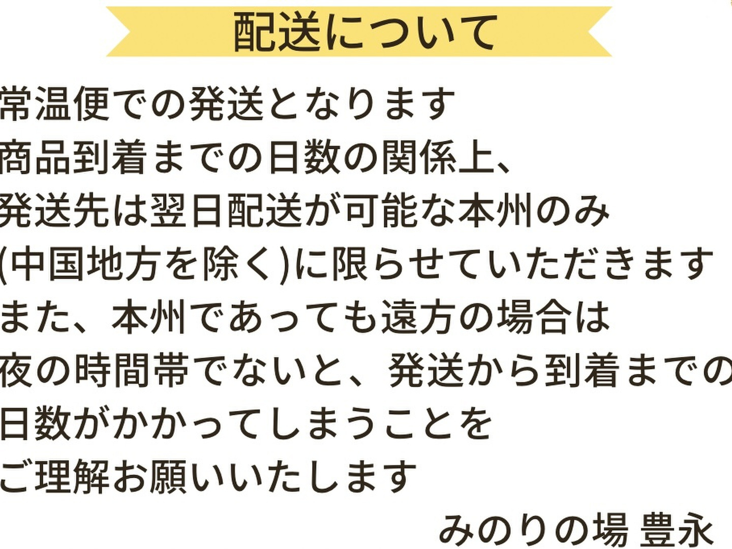 ※常温便での発送となります。商品到着までの日数の関係上、発送先は翌日配送が可能な本州のみ(中国地方を除く)に限らせていただきます。