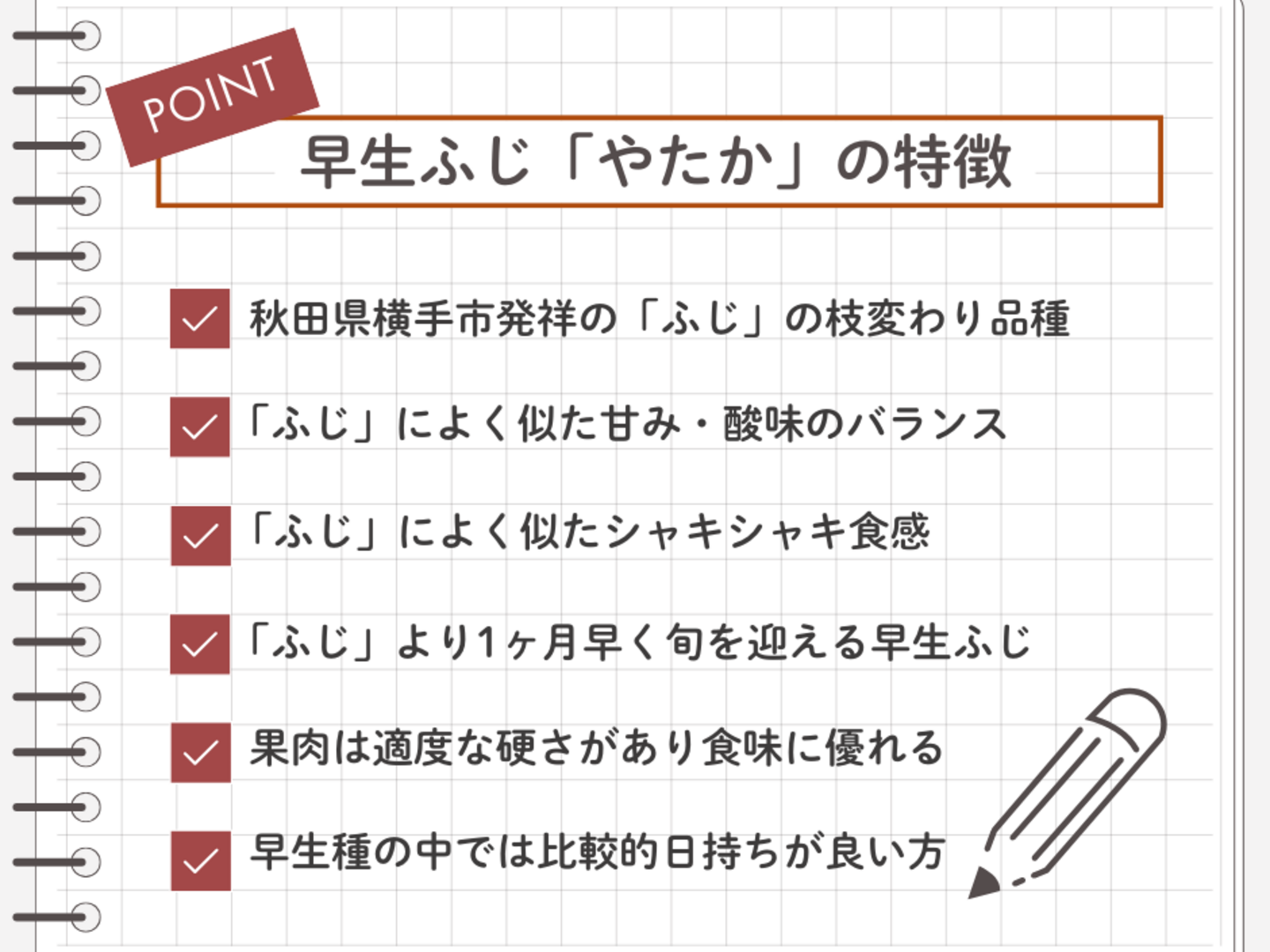 「やたか」の特徴は甘みと酸味のバランスが良く、噛んだときの食感や甘さも「ふじ」にとても似ているため早生ふじとして大人気です。