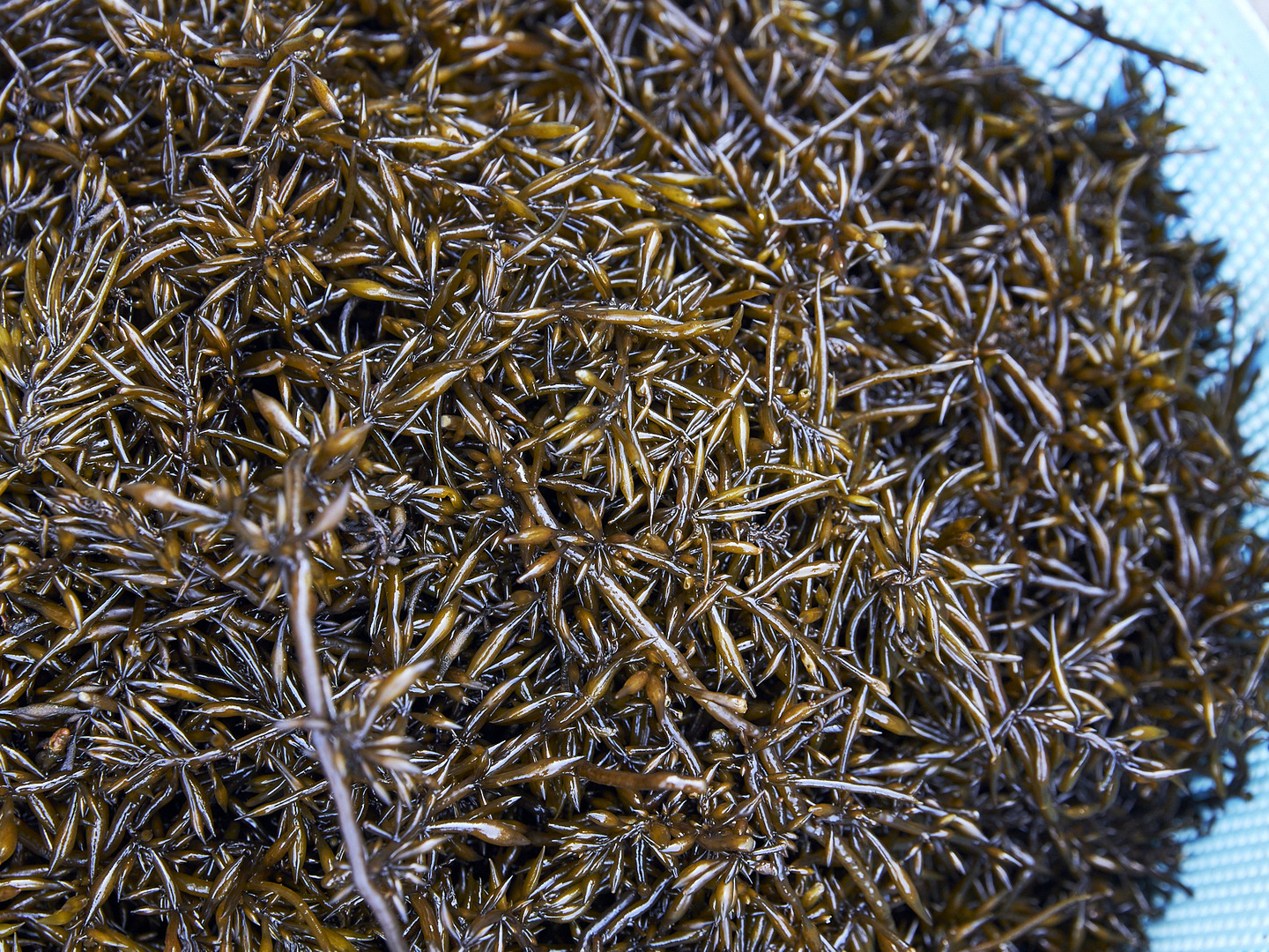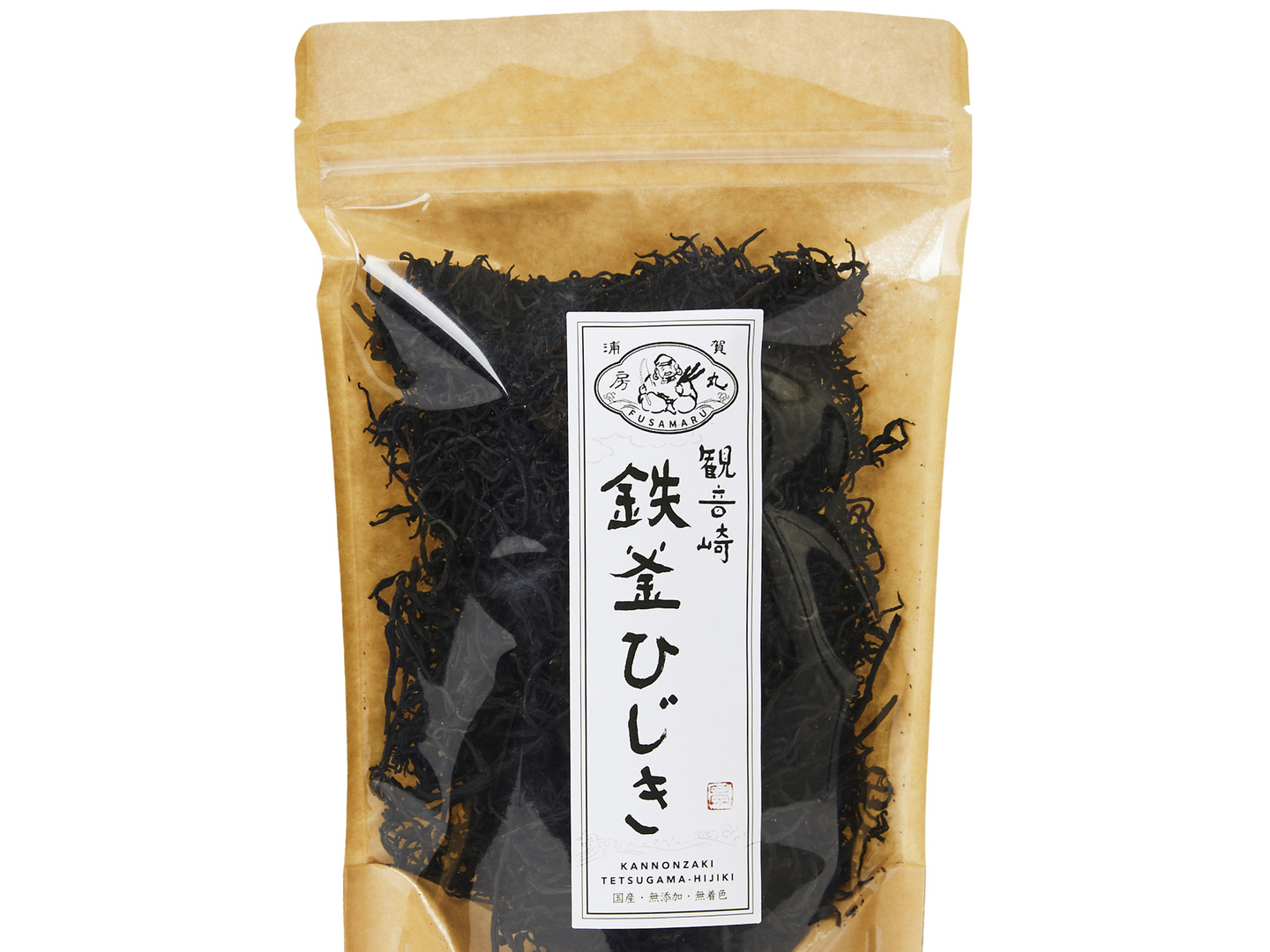 ひじきは鉄釜で煮た稀少なひじきです。ひじき自体に鉄分は少なく、鉄釜で煮ることでステンレス釜使用のひじきと比較すると鉄分が8倍多いです。定番の煮物にすると、やわらかいながらもクタクタにならず、歯ごたえが良く【ひじきを食べていると思える】食感です。ひじきの形が一本一本しっかりしています。市販のひじきより、太く長いひじきです。戻し時間は10分程度です。煮物は、人参と油揚げだけのシンプルな、材料で戻し時間を含め30分程度で完成します。十分常温保存できて軽く量が多く、手土産にも喜ばれます。「何かちがう!前のひじきに戻れない」と嬉しい声も。ひじきができる迄の工程は、鉄釜で煮る→網戸に広げて乾燥→ピンセットで人力でごみ取り→袋詰めです。