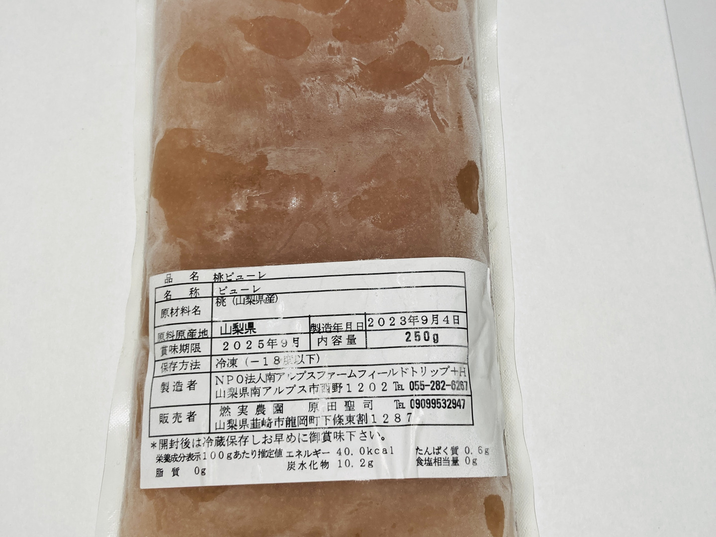 山梨県産の桃を使用して作った果実100%の桃ピューレです。