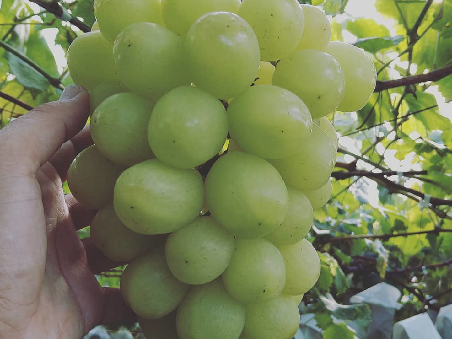出品中の【雄宝】はこの天山とシャインマスカットの掛け合わせです。ひと口で食べきれない大粒になる品種です。パリッと皮を破るとみずみずしい果肉が出てきます。