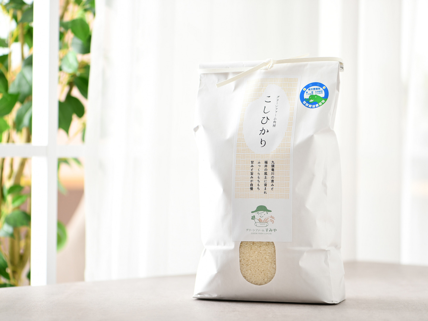 福井県あわら市にあるグリーンファーム角屋が作る特別栽培の『コシヒカリ』は、化学肥料を使わず、農薬使用は田植時の除草剤のみ。安心安全はもちろんのこと、お米の自然なおいしさを追求した毎日食べても飽きないお米です。