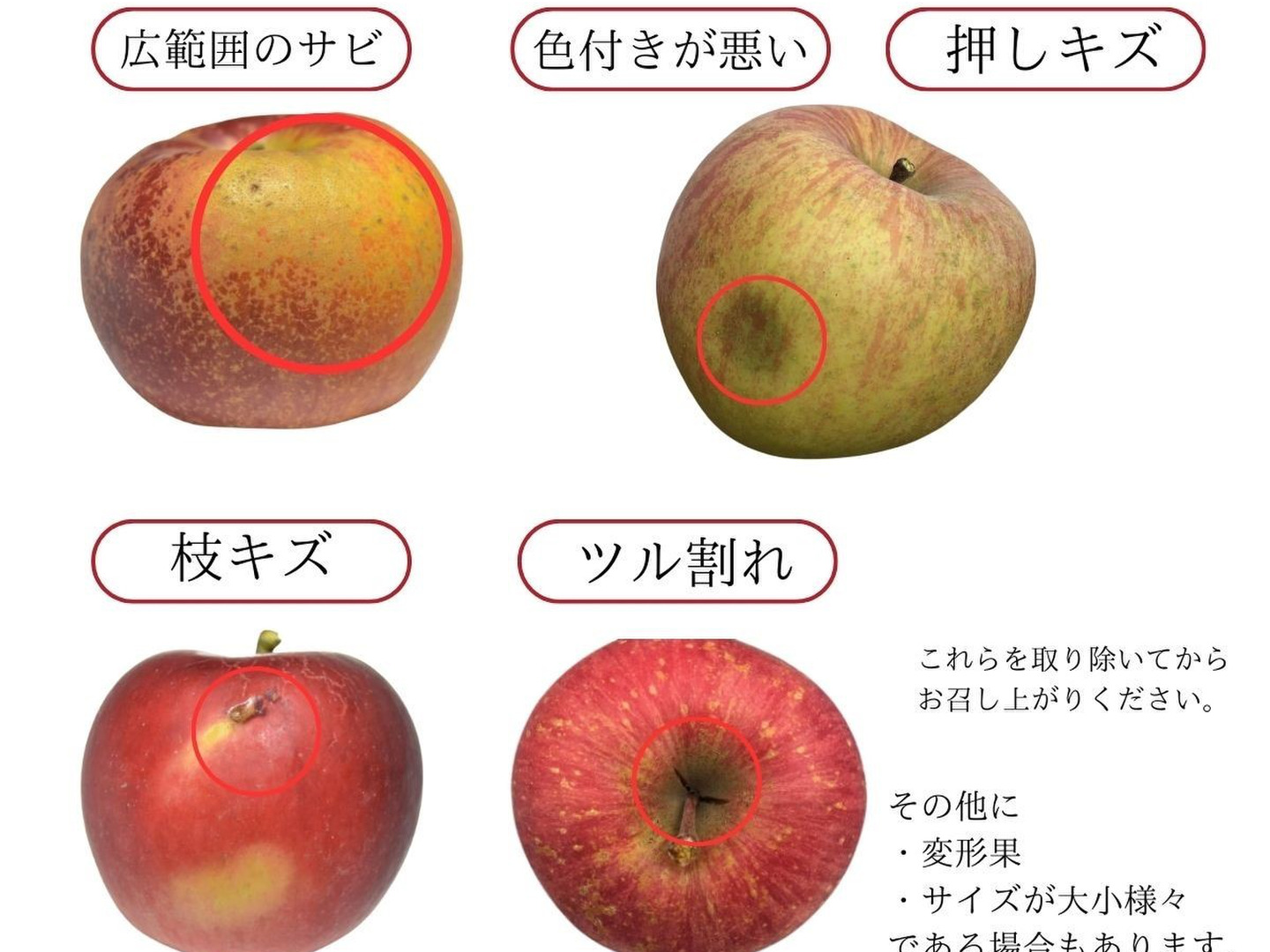 りんご全体が腐っていたり、食べられない程の痛みがあるりんごは入りません。また木から落下したりんごをお入れすることも絶対にありません。