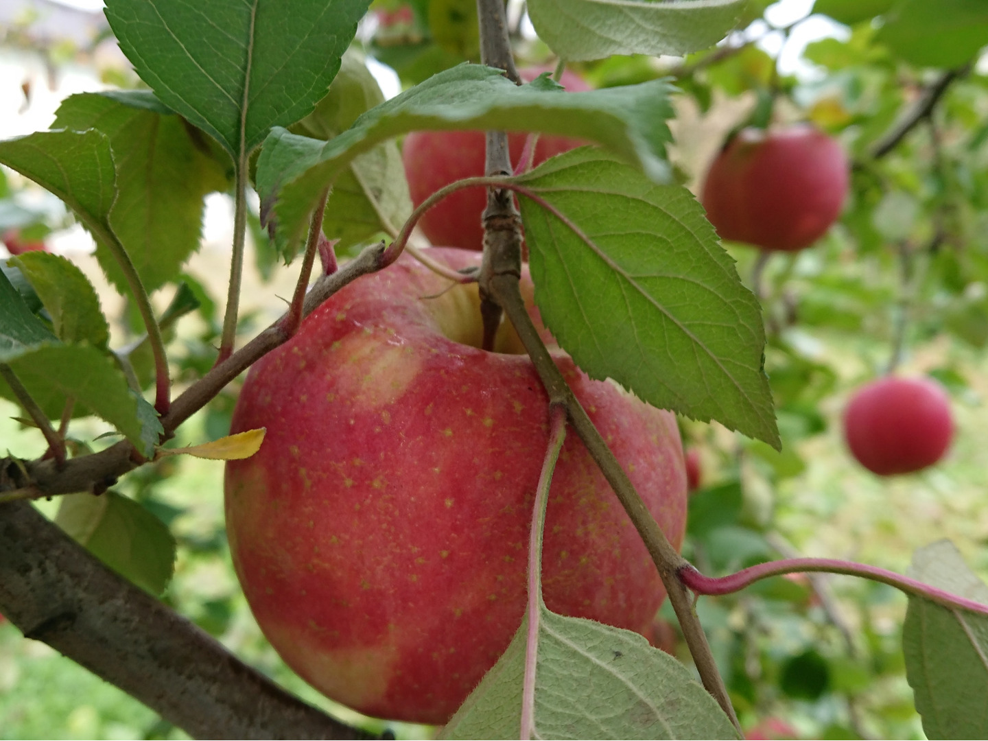 通常の栽培では、「見た目」を良くするためにりんごの実の周りの葉っぱを取ってしまいます。果実全体に均等に日光を当て、赤く色付くようにするためです。