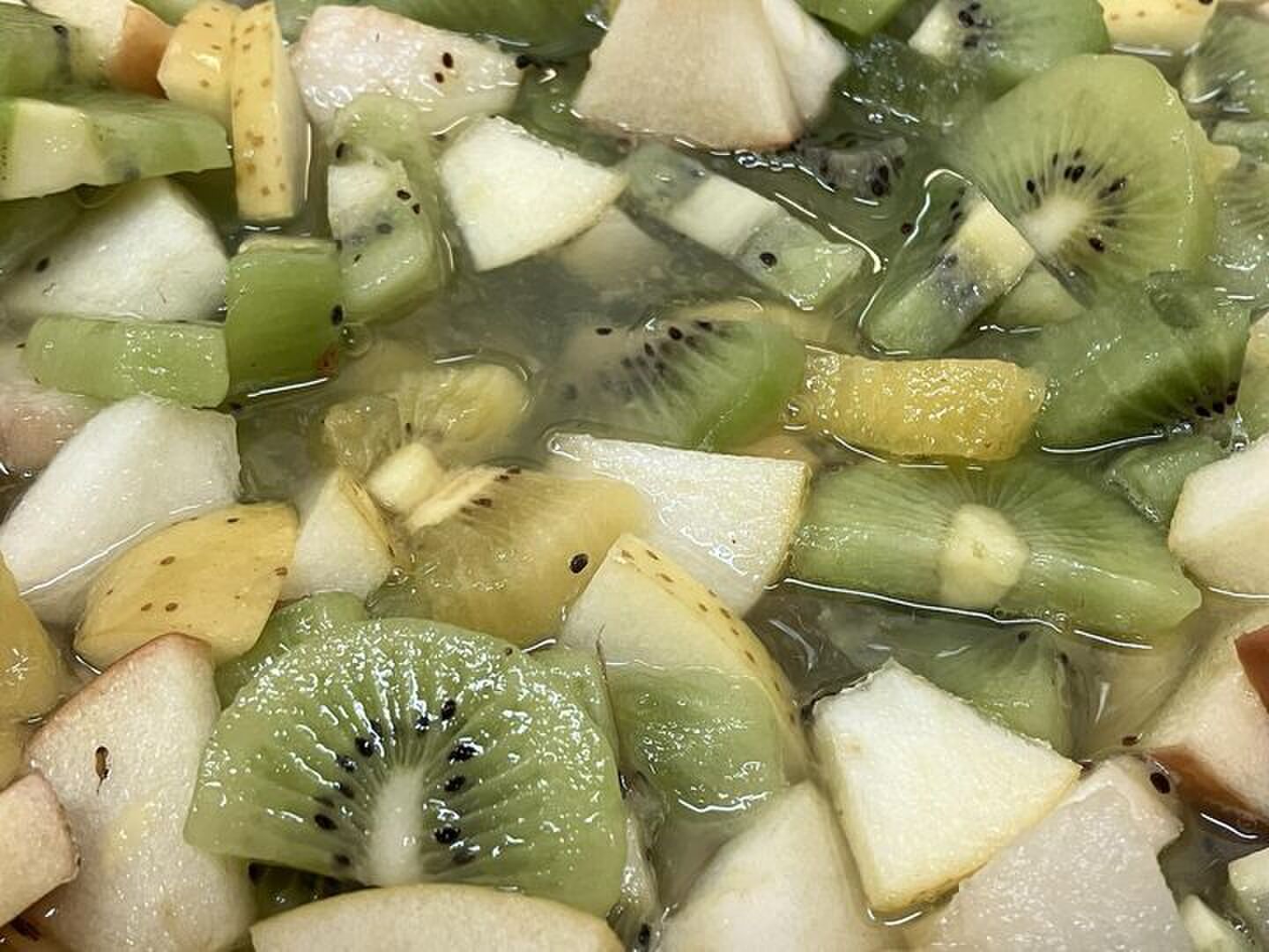 ※りんごと梨とキュウイの色合いがそのまま出て、エキスが溶けだしたピックル液はぜひ炭酸割りで。こちらは水で割ってもおいしく召し上がれます。朝のお目ざめに♪