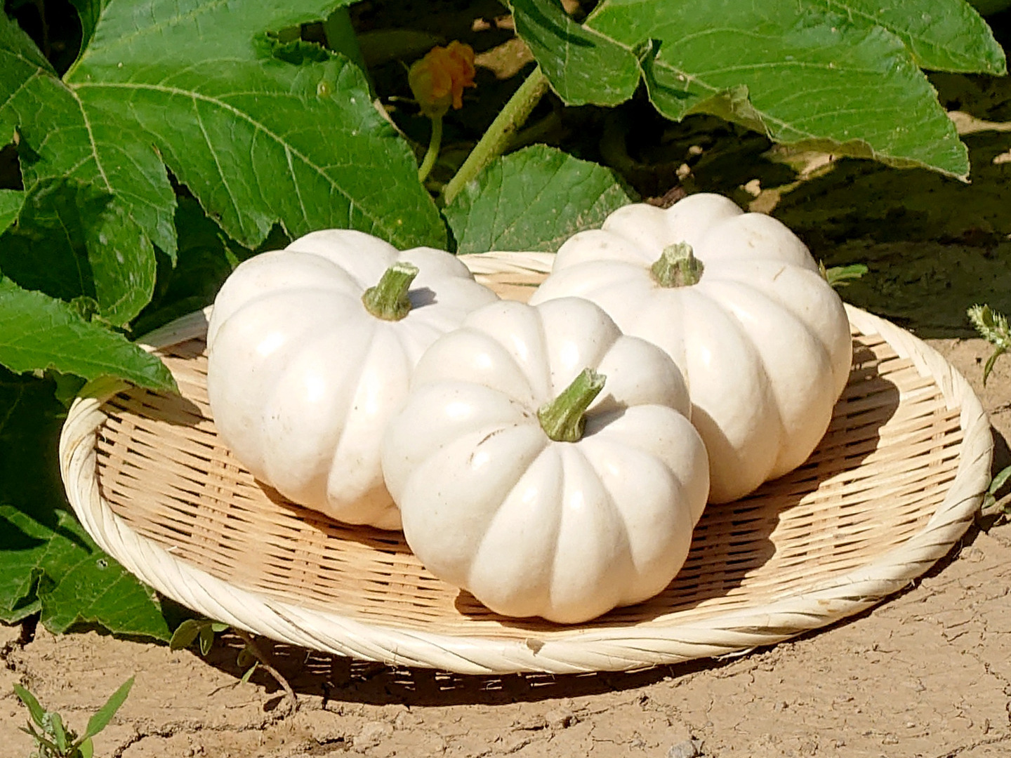 美しい白さ、ほんのりと優しい甘味、グラタンやサラダなどの器にも使える★手のひらサイズのプチホワイトかぼちゃ(3玉)[化学農薬・化学肥料不使用]