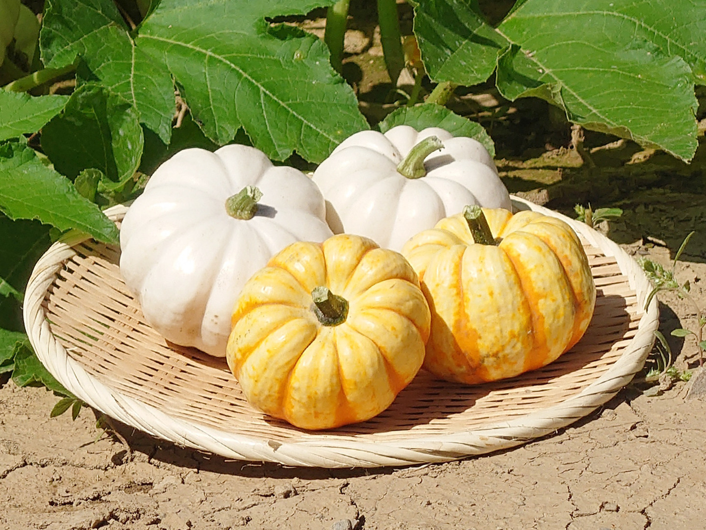 可愛くて、味も美味しい!グラタンやサラダなどの器にも使える★手のひらサイズのプッチーニ(2玉)&プチホワイト(2玉)のかぼちゃセット[化学農薬・化学肥料不使用]