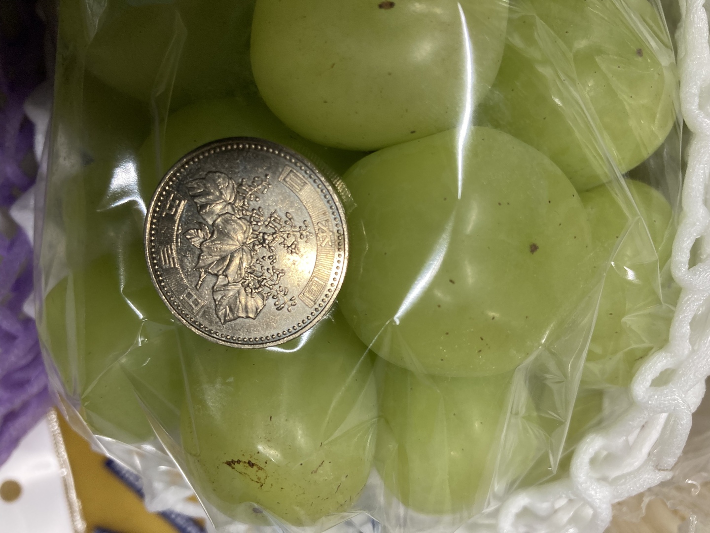 雄宝は、裂果した粒を抜いて穴が空いてしまったり、粒がちょっとだけ割れてるのが数粒あったり、品種特性の甘くなった証拠である、茶色いシミが少しあったりする訳あり雄宝です♪ 茶色いシミは見た目はイマイチですが、糖度が上がってる証で、食べたらむしろ甘いです♪