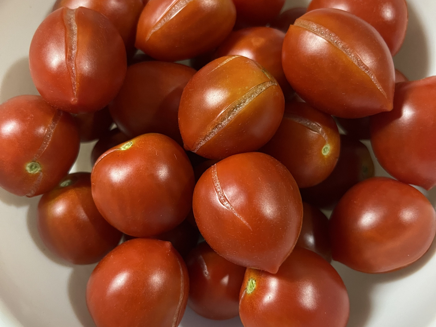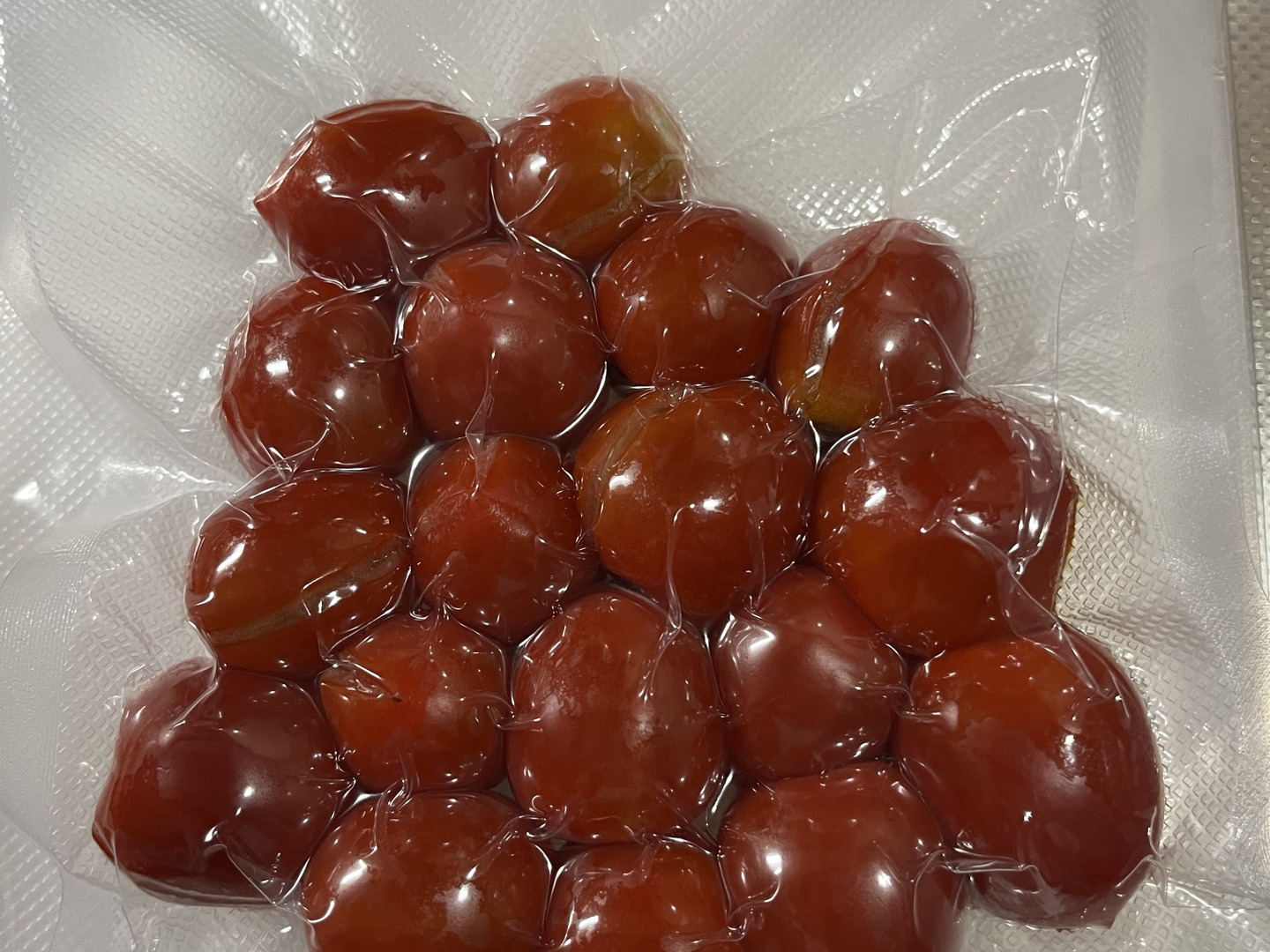 高糖度ミニトマトの規格外品(割れ)を新鮮な内に、真空パックに入れて冷凍しました。