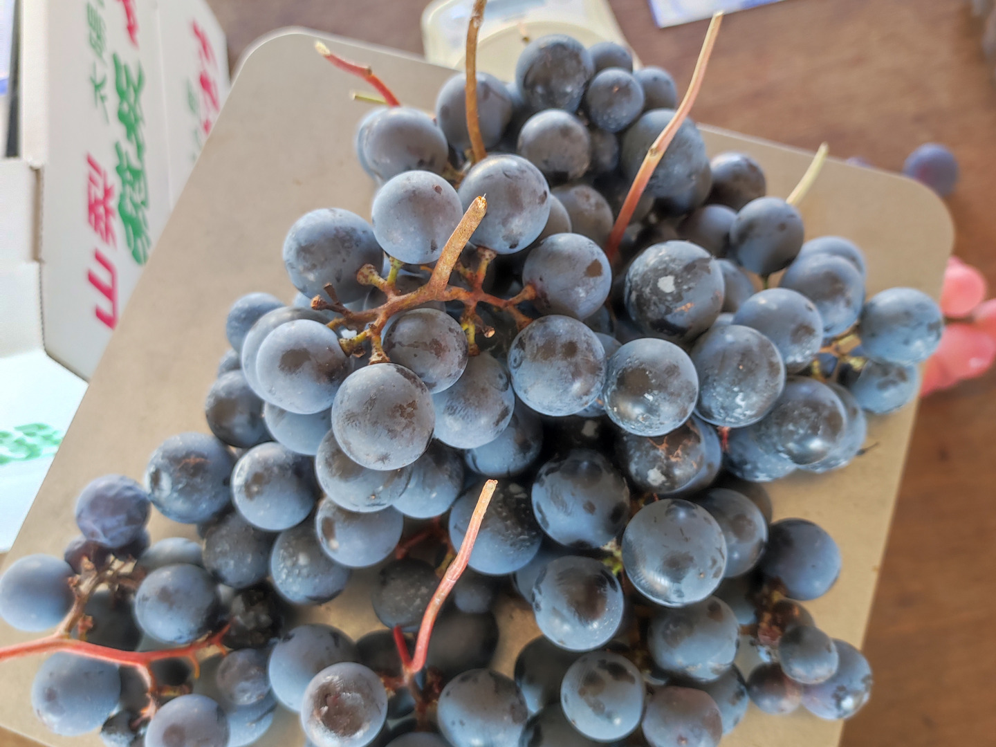 完熟期なので甘くて濃厚な味わい。昭和40年ぐらいまでは一般家庭で食べられていた 懐かしい味。デラウェアと同じで軸が細くクール便(冷蔵便)の方が鮮度を保てます。