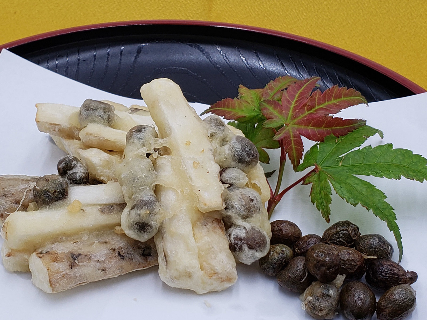 表皮は濃い茶色でホクホク食感の珍しい食材で、塩茹でにし炊込みご飯や天ぷら揚げでお召し上がりください。