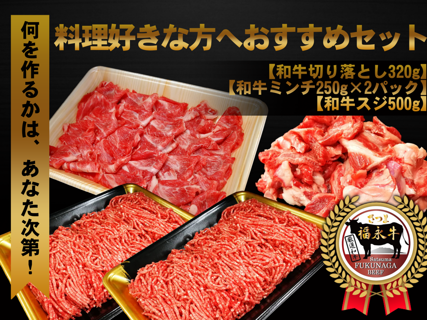 【料理好き必見】ワクワク料理セット(10人前)[ 特選切り落とし320g & ミンチ250g×2P & 牛スジ 500g ]鹿児島県 黒毛和牛 牛肉 さつま福永牛 受賞歴多数[ 取り寄せ 誕生日 ]