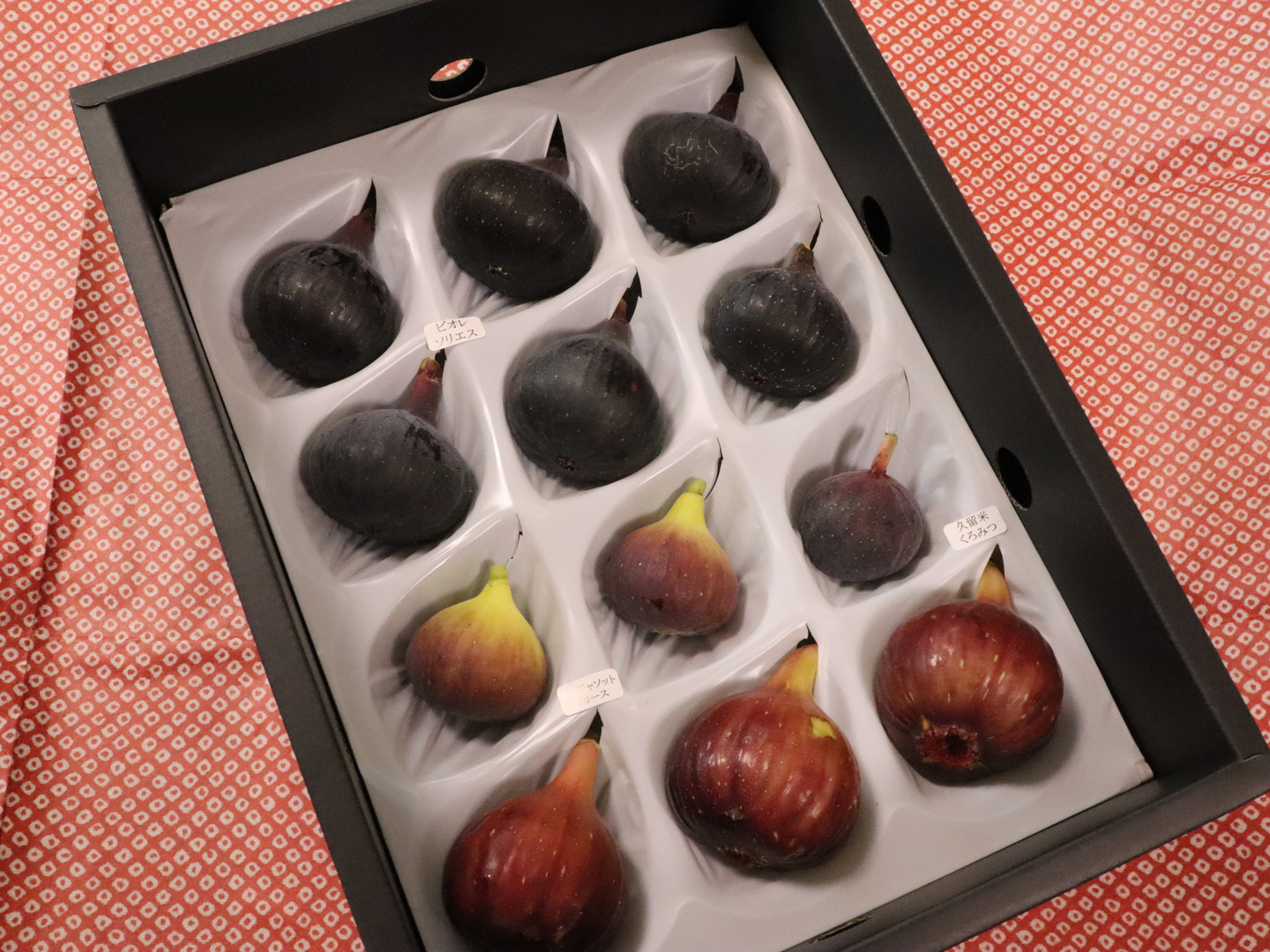 珍しい黒いちじく「ビオレソリエス」6個とおなじみの赤いちじく「桝井ドーフィン」3個、その他の品種が3個、合計12個の完熟いちじく食べ比べセットです。