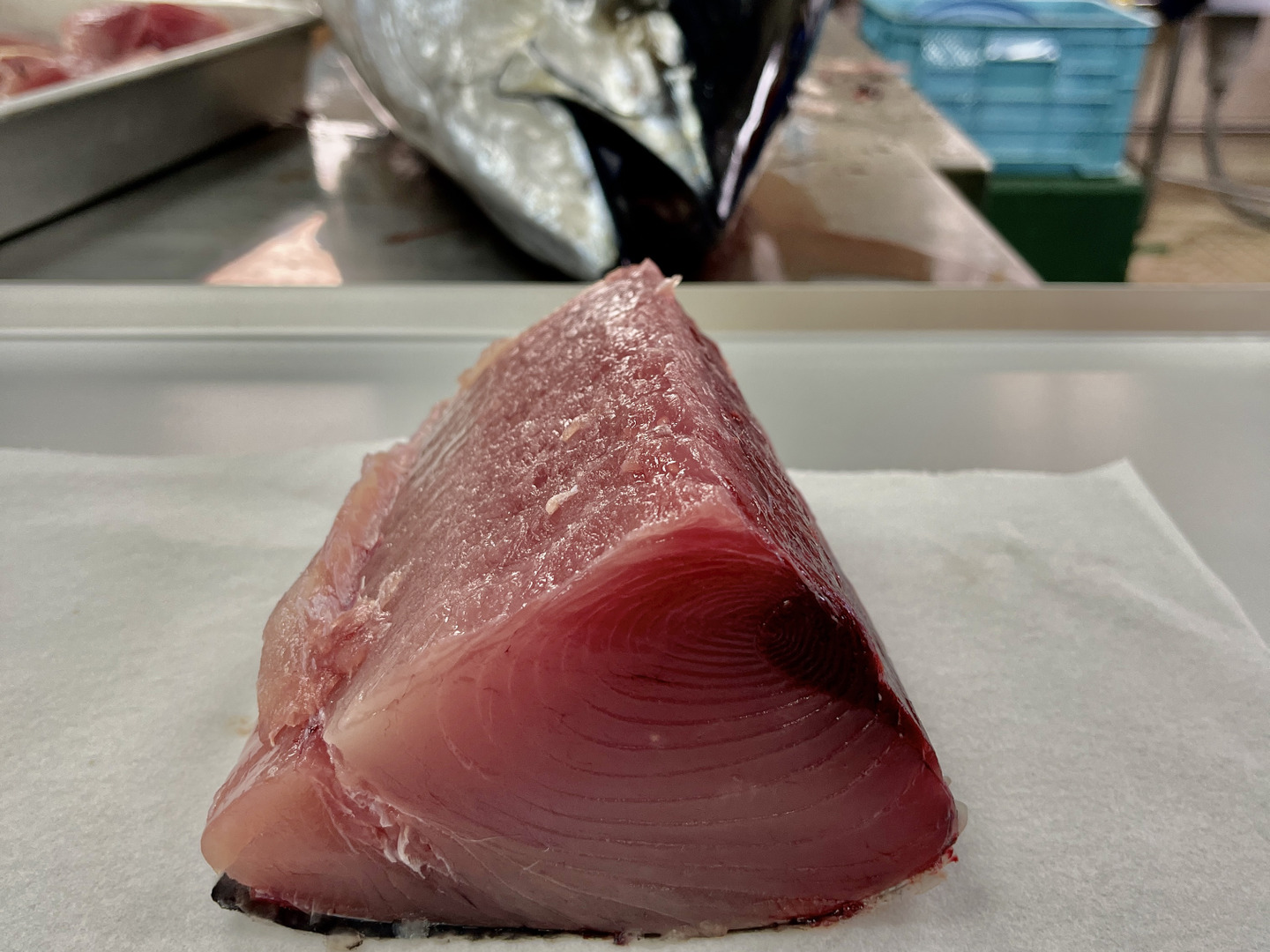 宮古島の近海、黒潮で漁獲する生体で15〜20kgのビンチョウマグロです。マグロにストレスを与えないように全自動マグロ釣りロボットで一本一本丁寧に釣り上げて、即船上活き締め、血抜き、神経締めを行い鮮度を保持しています。