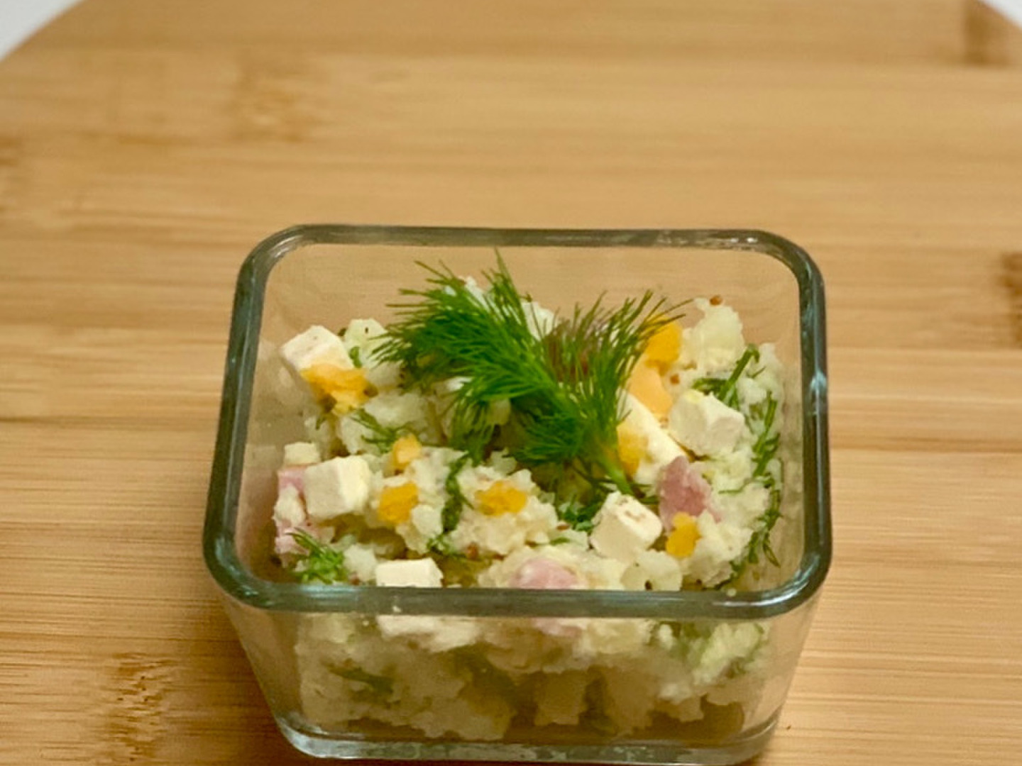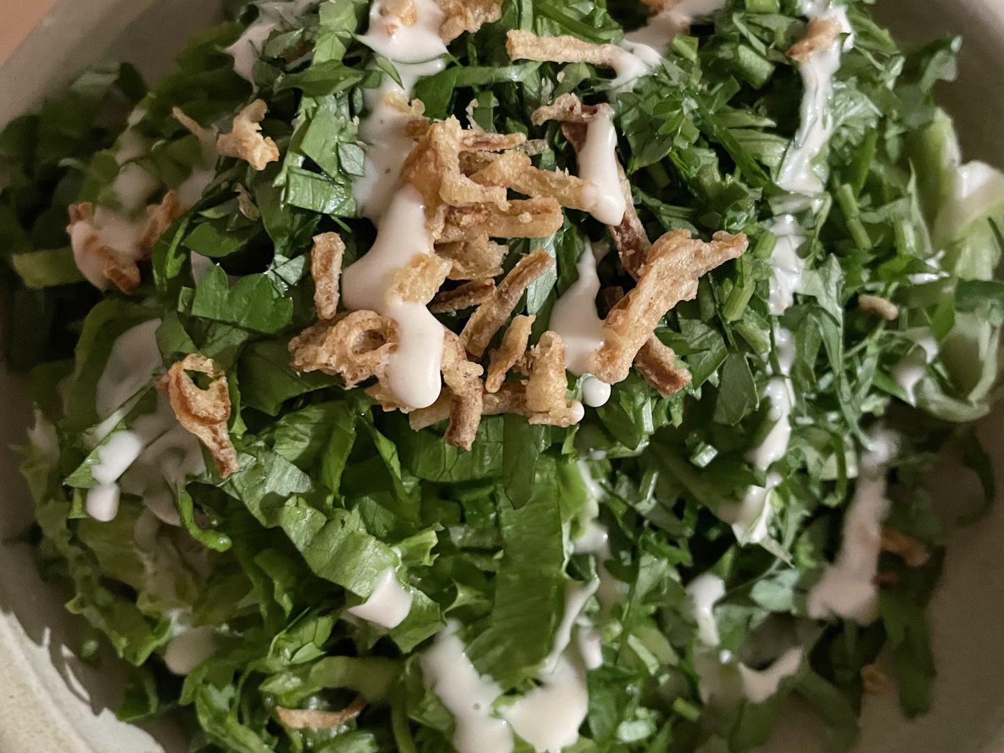 1. デイル、イタリアンパセリ、スペアミントをそれぞれ小さくカットし、千切りしたレタス少量と混ぜてフライドオニオンをのせる。