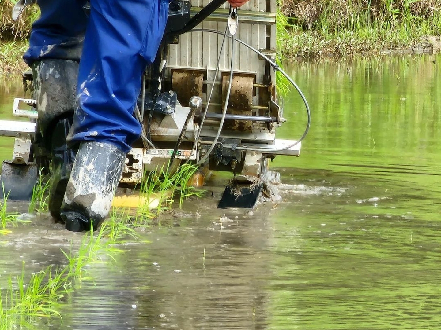 大きい田んぼは、大型の機械を使えますが…昔からの小さい田んぼは…手押しの小型の機械も使って栽培しております。