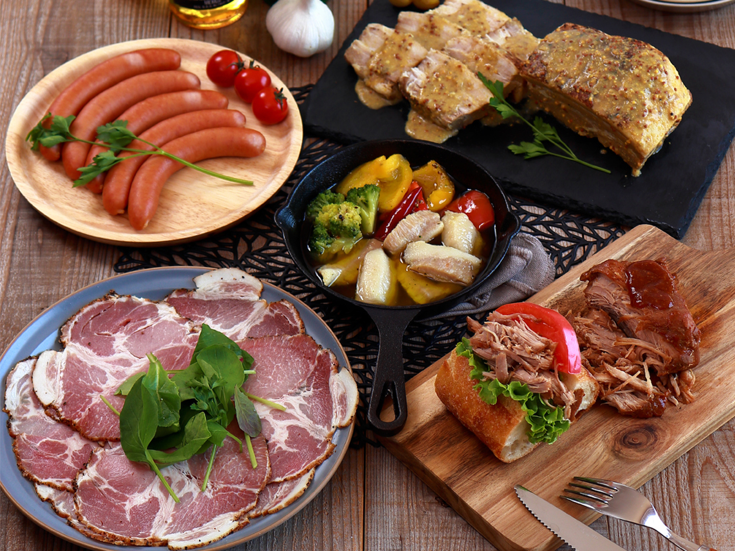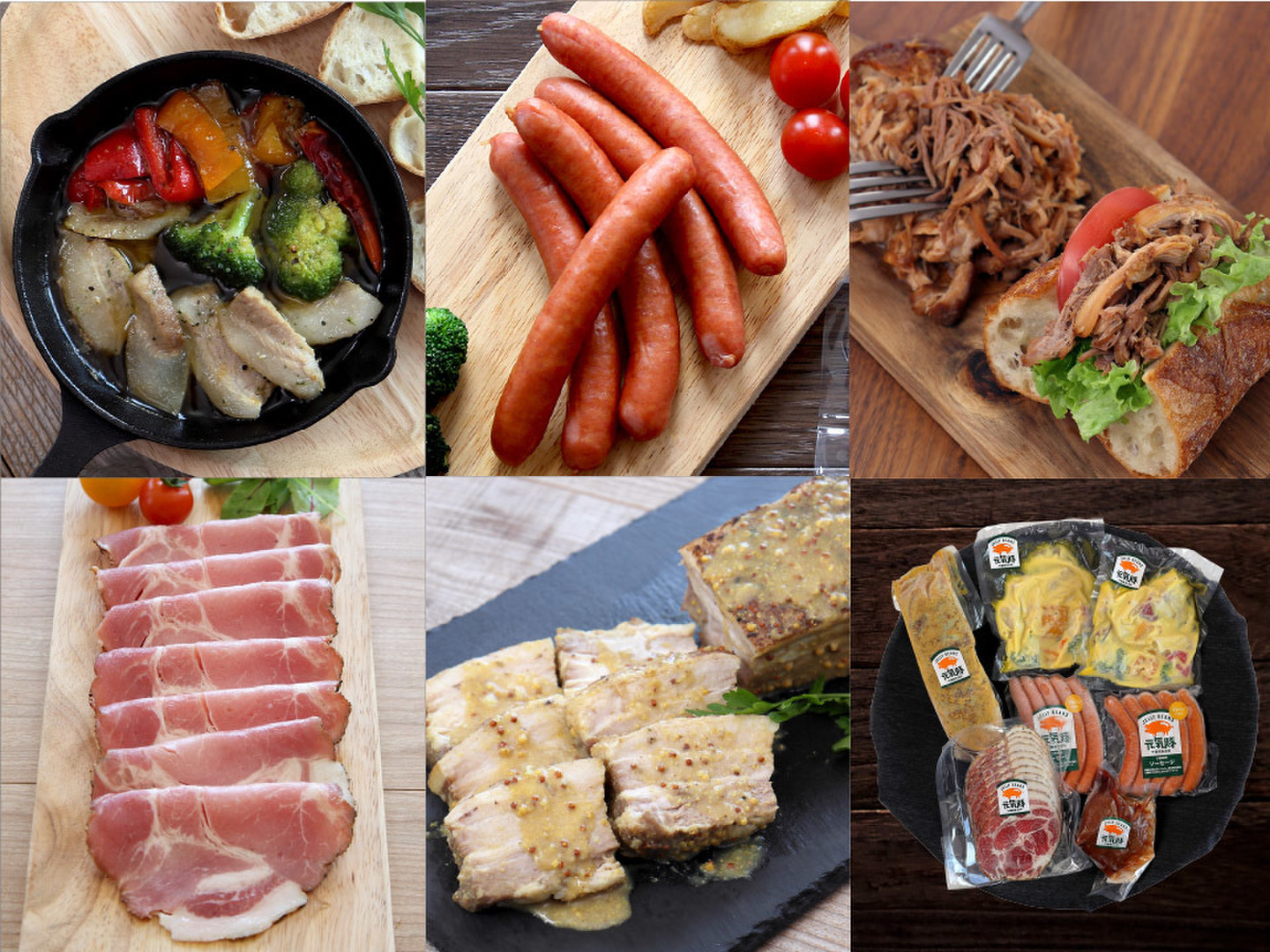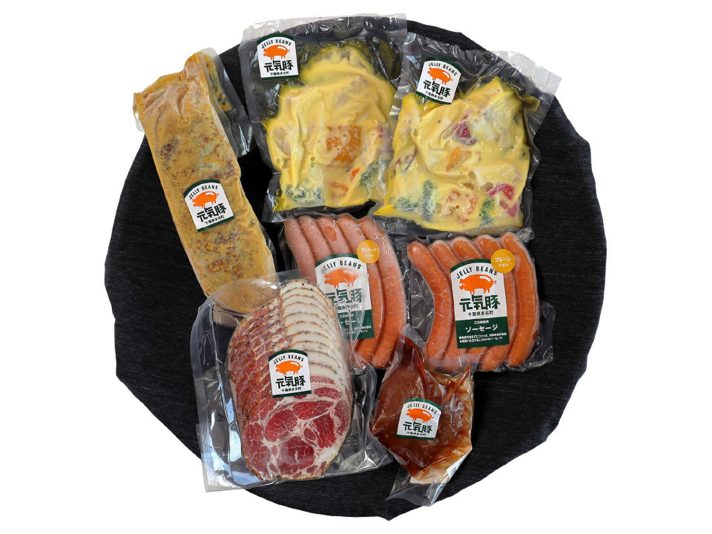 | 内容 | 豚トロアヒージョ 200g×2、ソーセージ(プレーン)200g(5本入)×2、プルドポーク 200g、ペッパーシンケン(スライス)200g、豚バラのハーブ煮込み(粒マスタード)約700g(不定貫) | ||||||