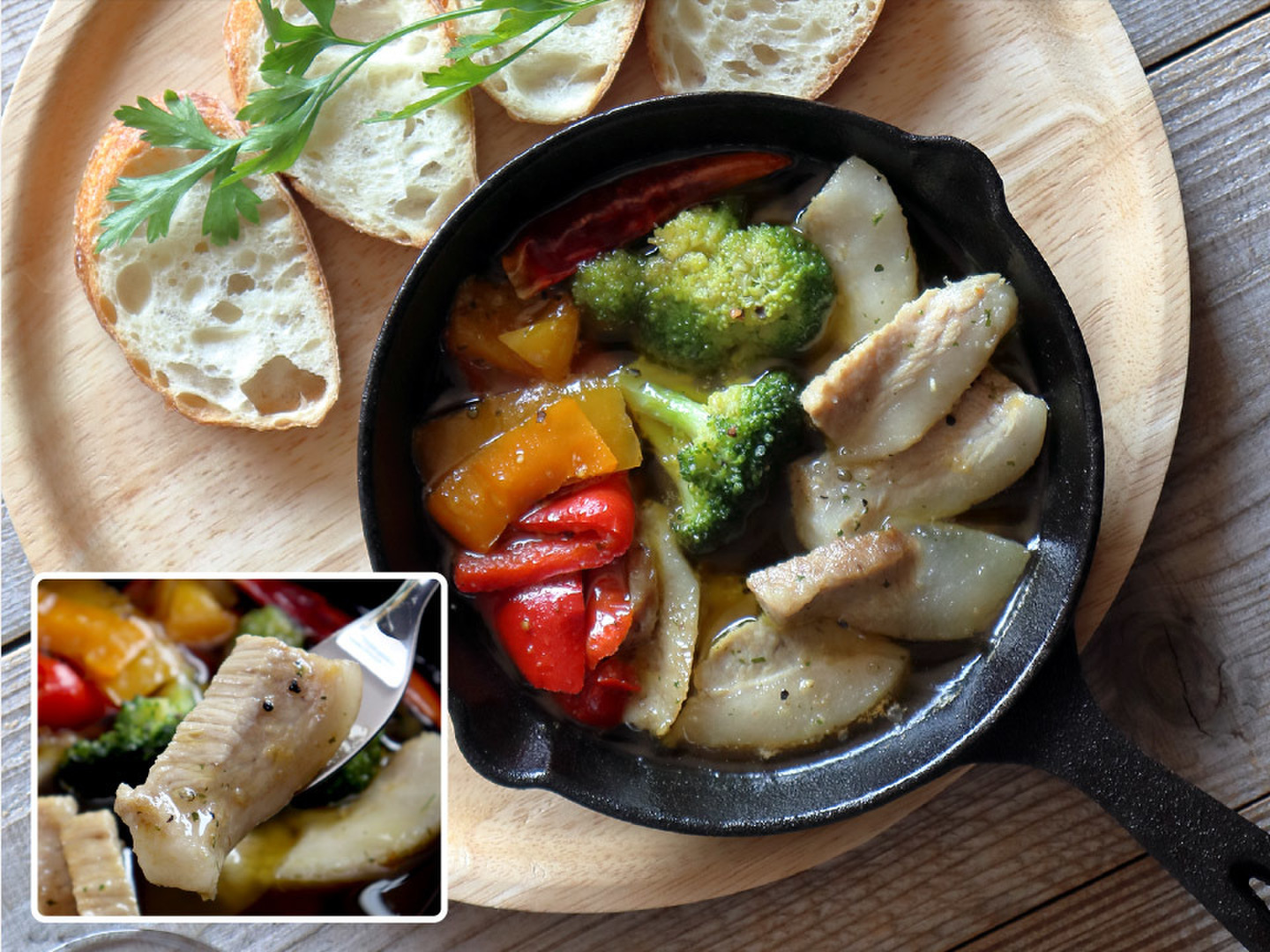 - 新商品の豚トロアヒージョはなんと野菜入り!