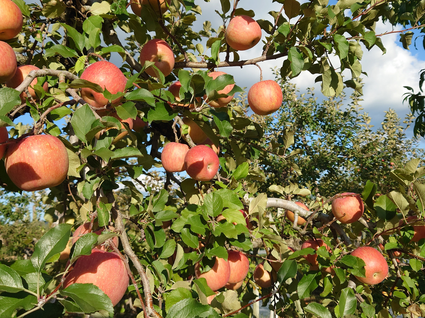 当果樹園では赤く色づいたりんごを収穫するために、手間暇を惜しまず樹上のりんごを栽培管理しています。