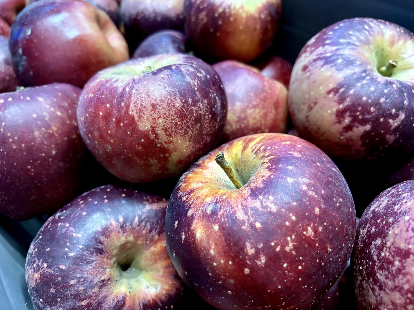 秋映(あきばえ)」は長野県生まれのりんごで、皮が濃い紅色をしているのが特徴です。