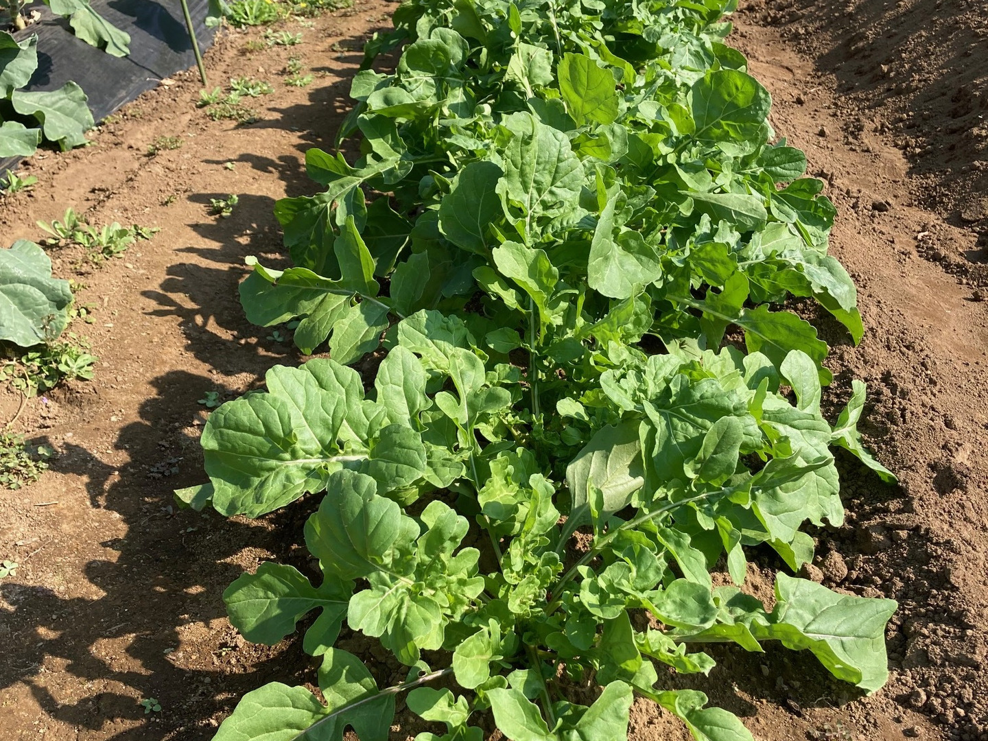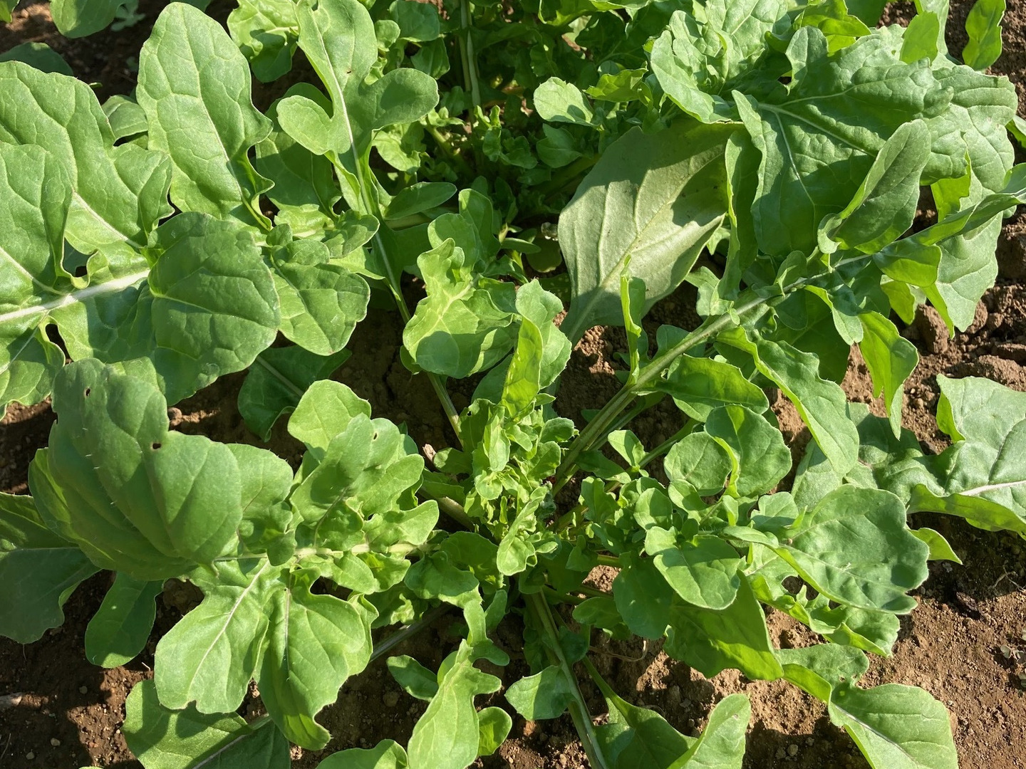 露地栽培のルッコラです。農薬は使わずに手作業で除草、除虫をしております。胡麻の風味が強めで若干の辛味が爽やかです。