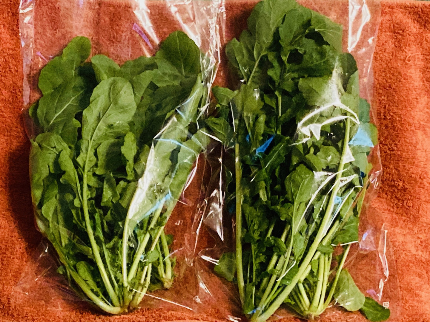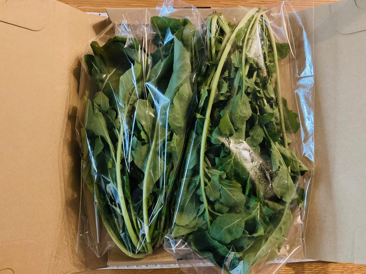 ルッコラ【ゆうバケット】に詰めてお届けします。写真は6株で約250gです。
