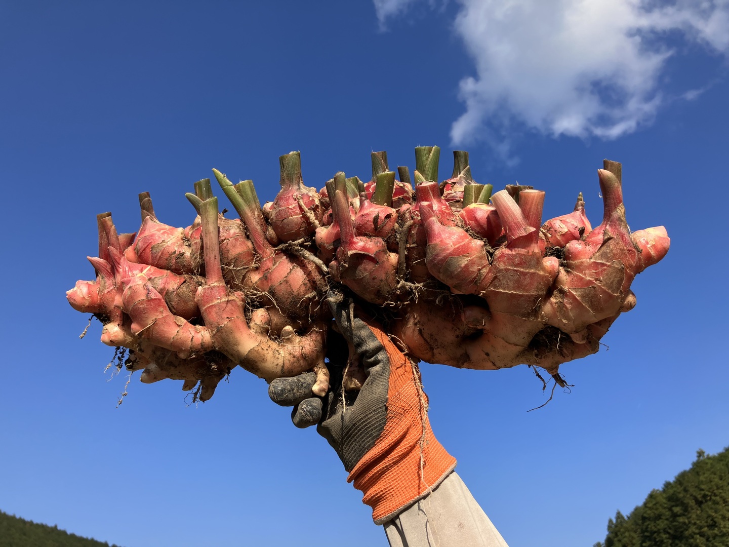 皮が赤く紅色をした赤生姜。通常の生姜より辛いです。掘りたては写真のような色味ですが、時間が経つにつれて赤茶色に皮が変化していきます。