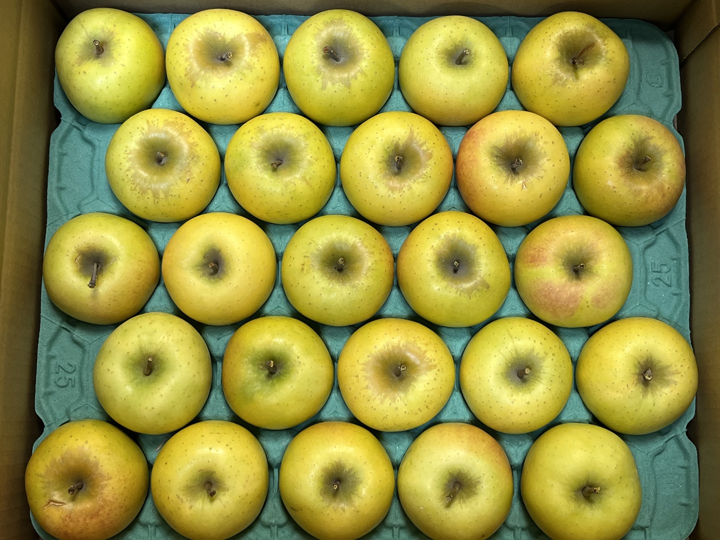 サクサクしていて、とてもジューシーで、甘味の中にしっかりとした酸味を感じることができる、さわやかな風味の黄色いりんごです。樹上で完熟したりんごをお届けします。