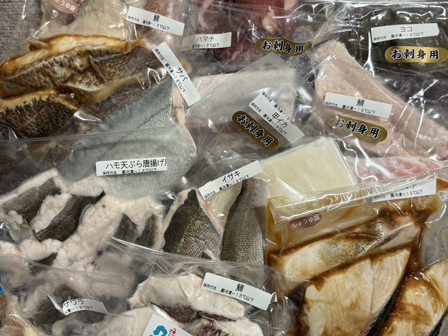 | 内容 | 切り身味付け3袋、味付け無し3袋、刺身ブロック4袋 | ||||||