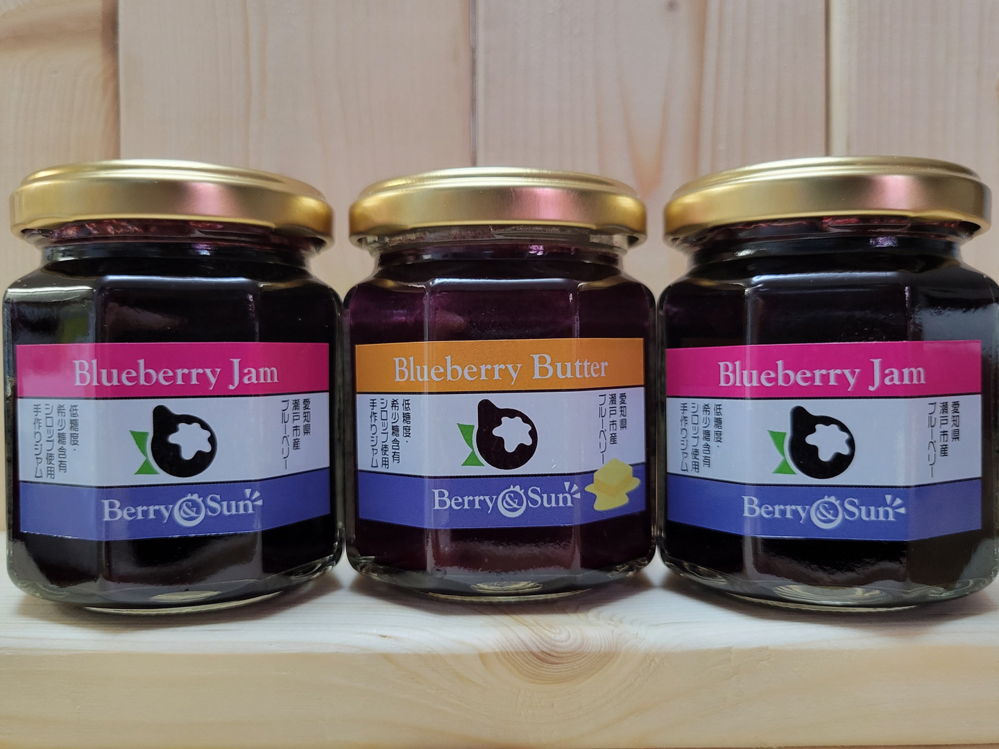 ブルーベリーバター(120g×1個)と、ブルーベリージャム(130g×2個)のセットです。ブルーベリーバターは数量限定品なのでこの機会にどうぞ!