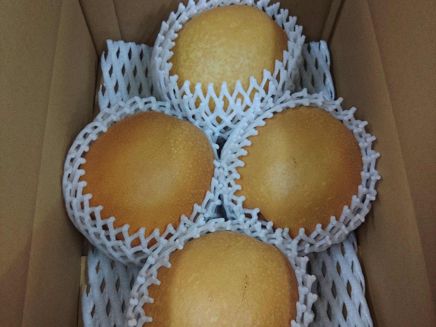 個性的な形と香りが有り、多少の酸味に、甘味とみずみずしさがある梨です。王秋梨はコルクスポットとゆう果実に黒い点が入っているものがございます。取り除いてお召し上がり下さい。説明書も添えて発送致します。