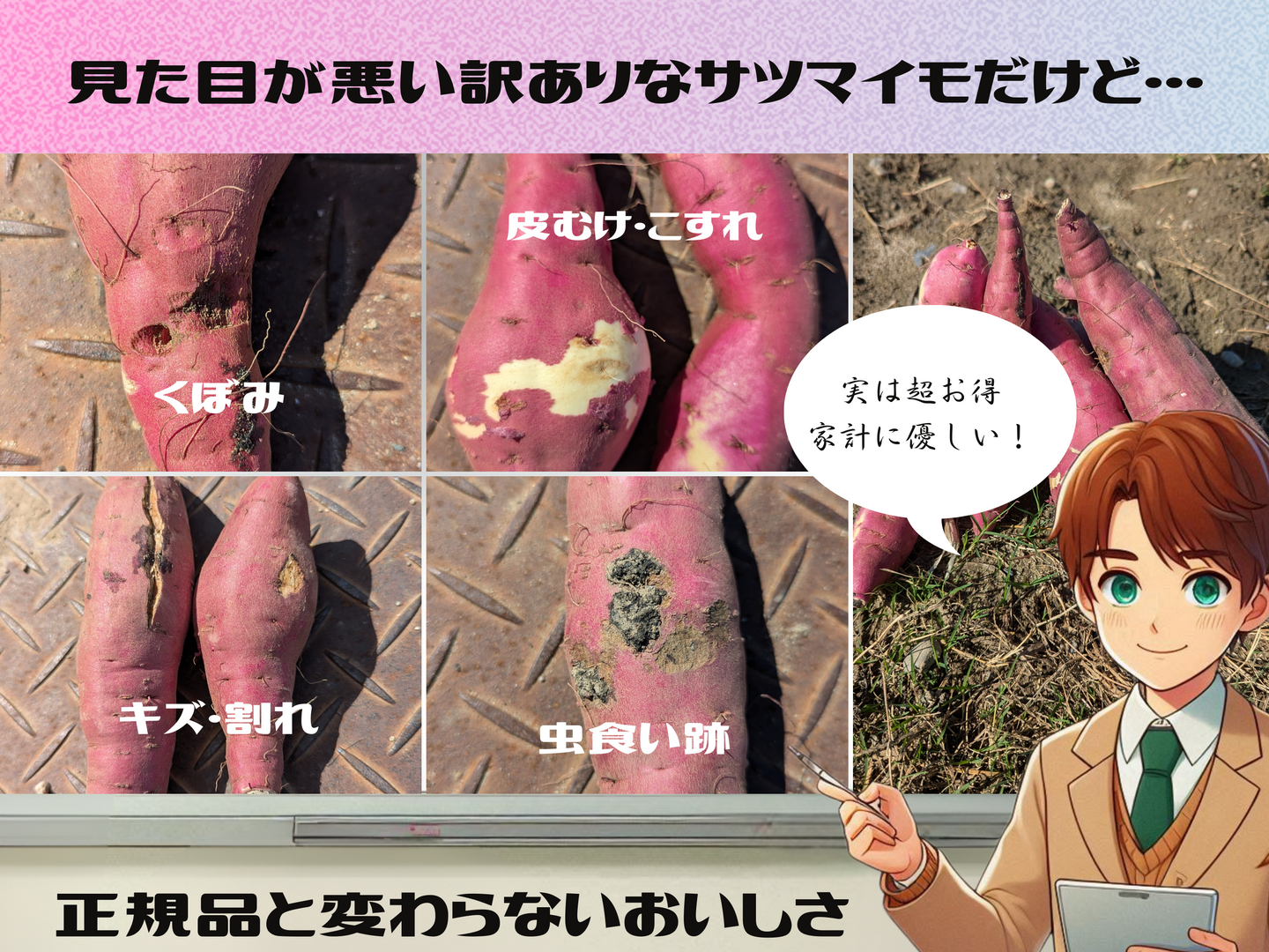 虫による表面的な食害跡 収獲、洗浄時についた傷と皮むけ さつまいもの折れ・裂けは入ることはありません