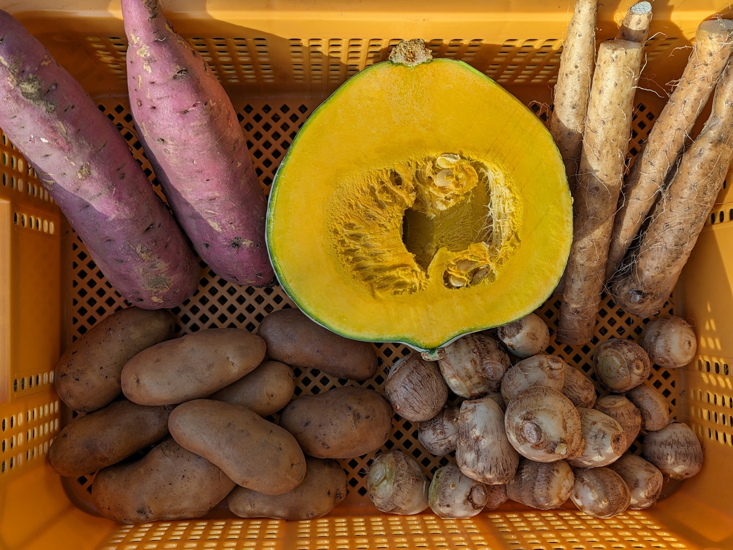ホクホクの里芋1kg、じゃがいも1kg、サツマイモ1kg、九重栗南瓜カット1kg、自然薯300gの5品目をセットでお届けします。里芋、じゃがいも、サツマイモ、南瓜の4品目分の価格で自然薯が入るお得なセットです。当農園の野菜や自然薯をお試しで召し上がりたい方にもおすすめのセットです。