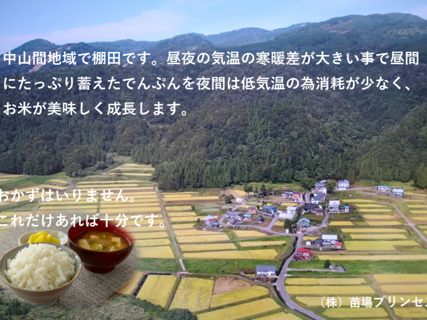- 中山間地の棚田の為、昼夜の寒暖差がデンプンを蓄え甘みが強いお米です。